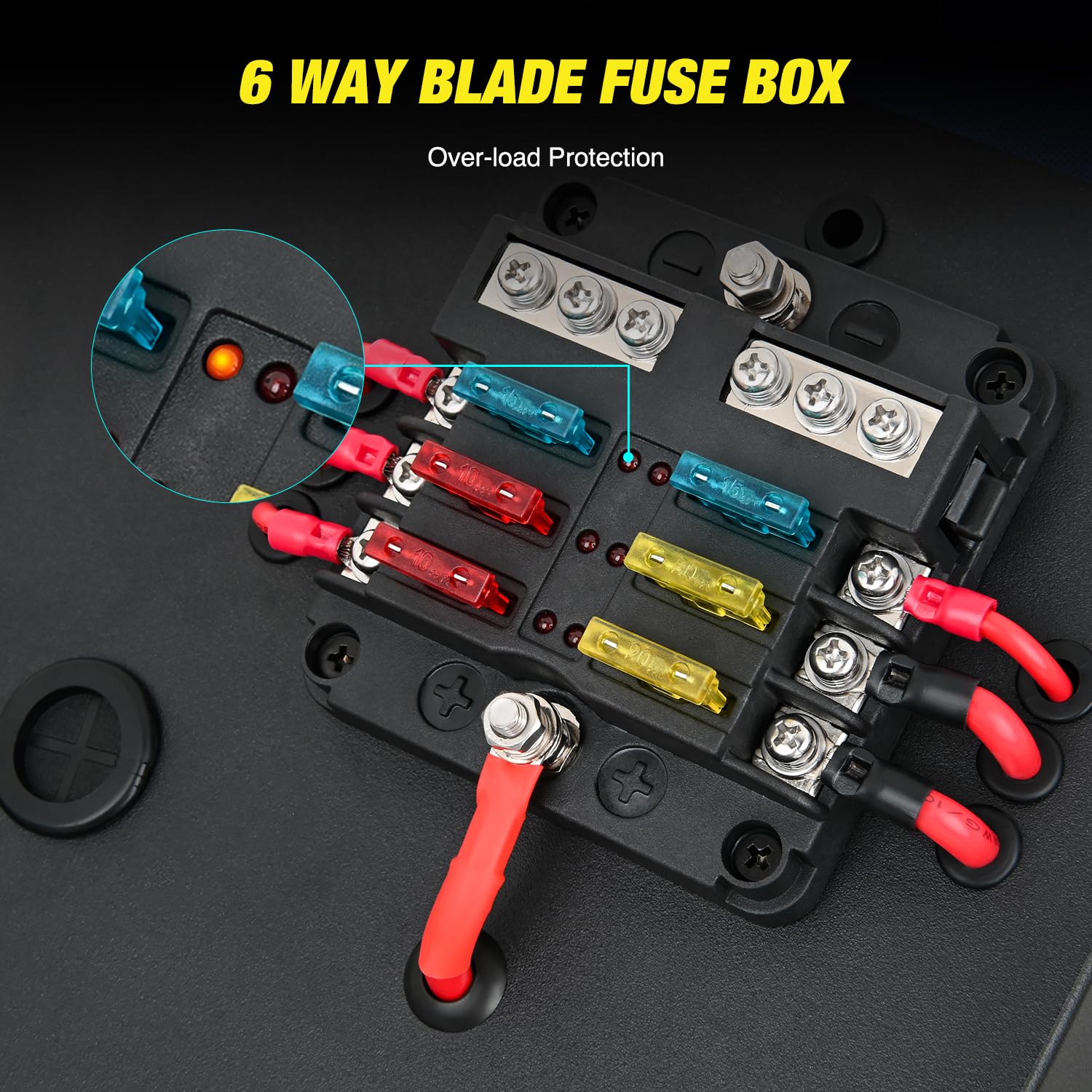 Safe and Stable: Provides a 6-way waterproof fuse box to effectively protect the circuit, prevent current overload and short circuit, and ensure power safety. Constructed with the LED voltage display, provides a real-time voltage monitoring, allows you to check the status of the voltage. The control box is equipped with upgradeable and rational wiring,including bus bar binding post for positive and negative poles,heavy-duty cables for high current loads,circuit safety