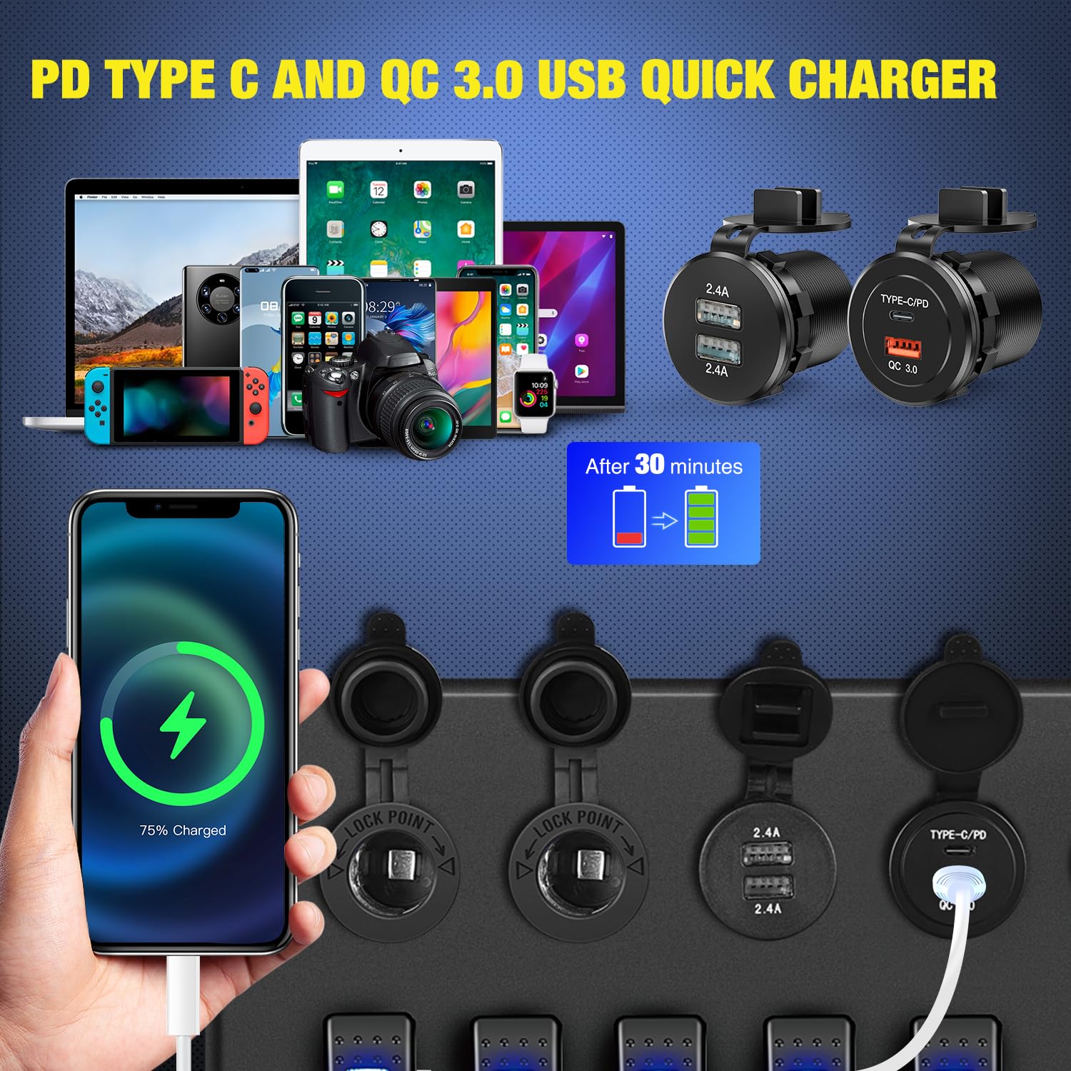 Multiple Functions: The power box is equipped with a variety of equipment to meet your needs, including a 6 way fuse block, 5 rocker switches, 2 cigarette lighter sockets, a dual USB charger and a PD Type C + USB charger ports, voltmeter, dual 50A anderson connect plugs reserved DIY area