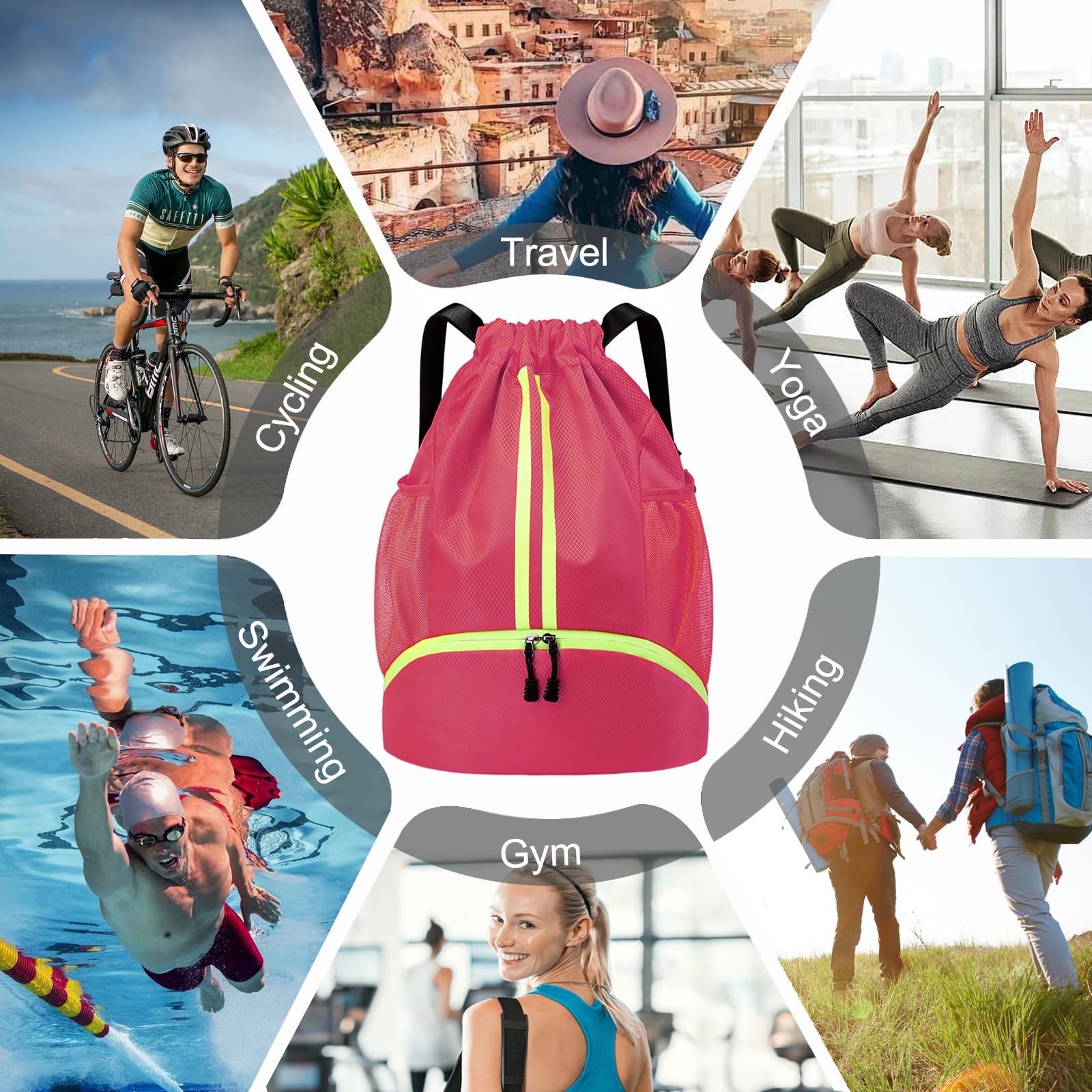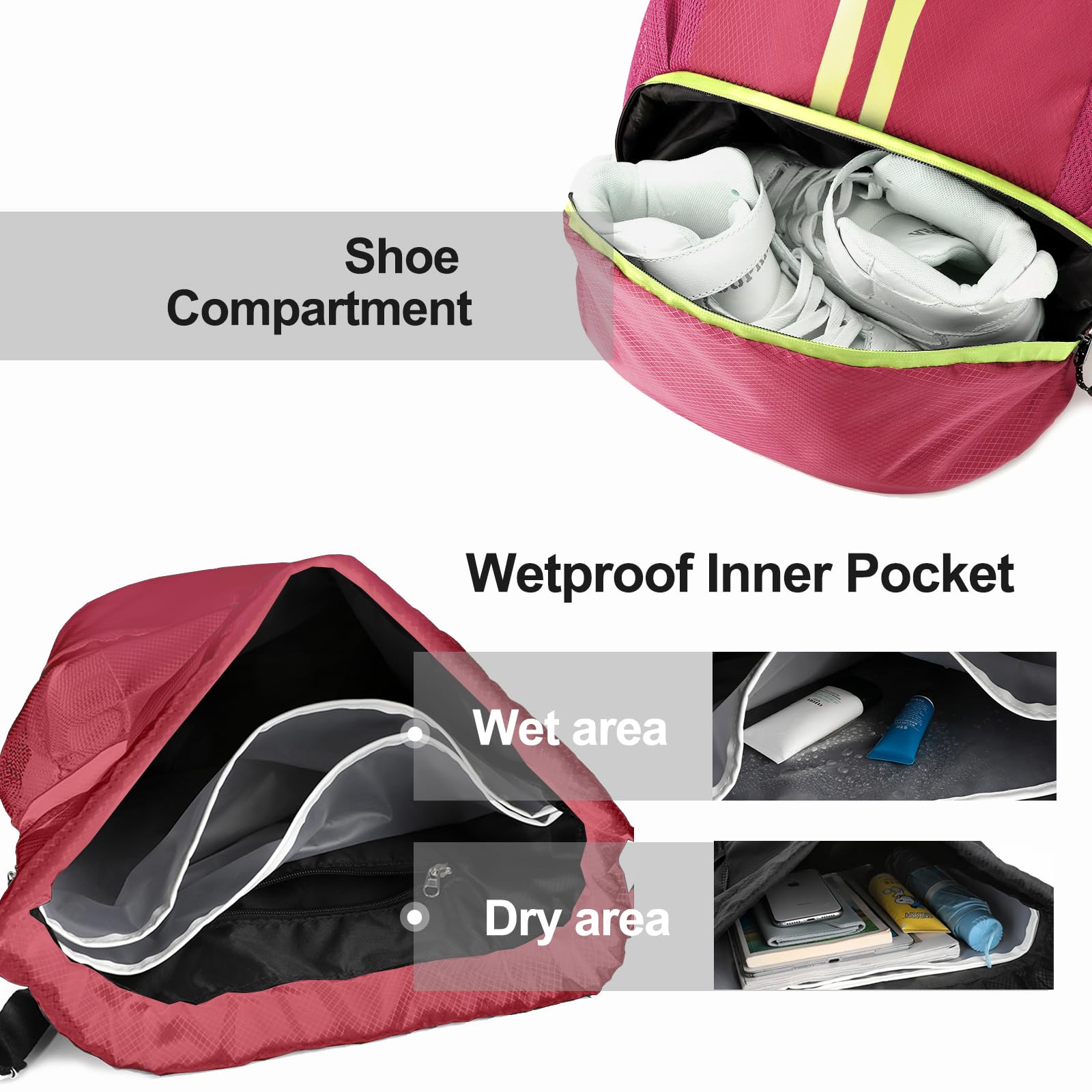Dry/Wet Separation: Our gym bag is designed with multi-pocket. There have independent shoes compartment and wet proof inner pocket, which makes it convenient for gym-goers, swimmers, and anyone who needs to keep their gear separated and organized