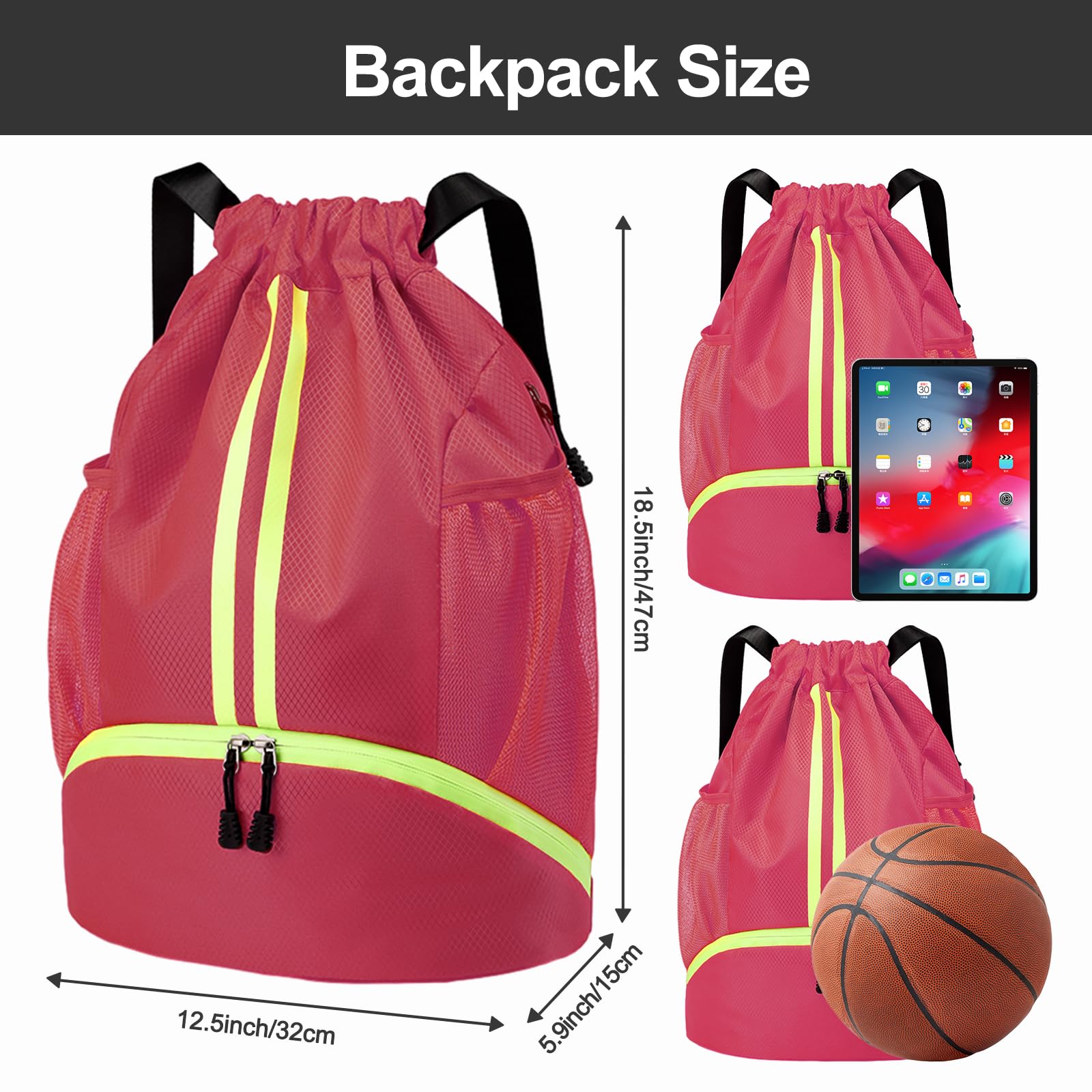 Large Capacity: The spacious space of this sports backpack ensures that you can carry training equipment, swim gear, beach items, all the essentials you need for workout. A basketball can be easily put in this bag without worrying about running out of space