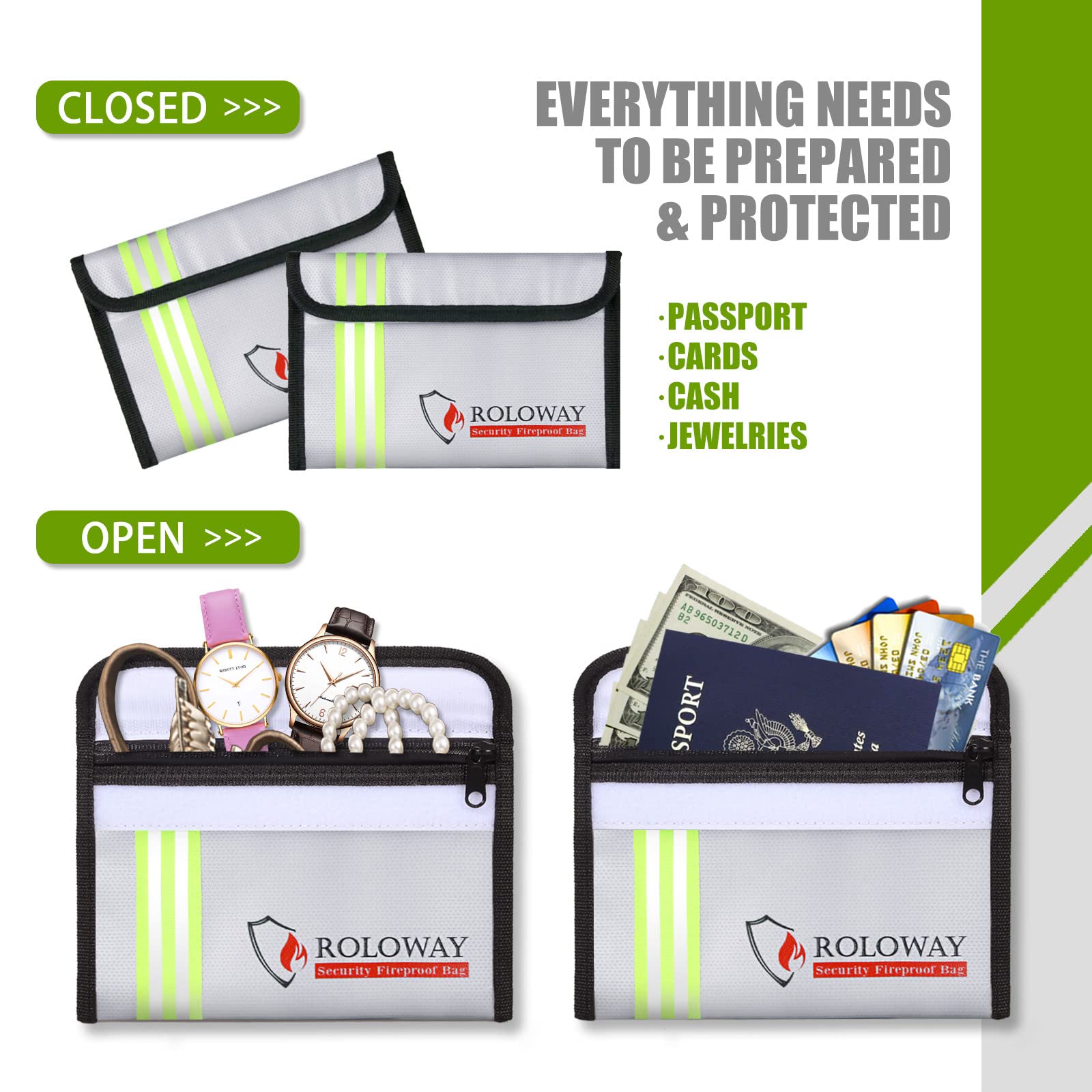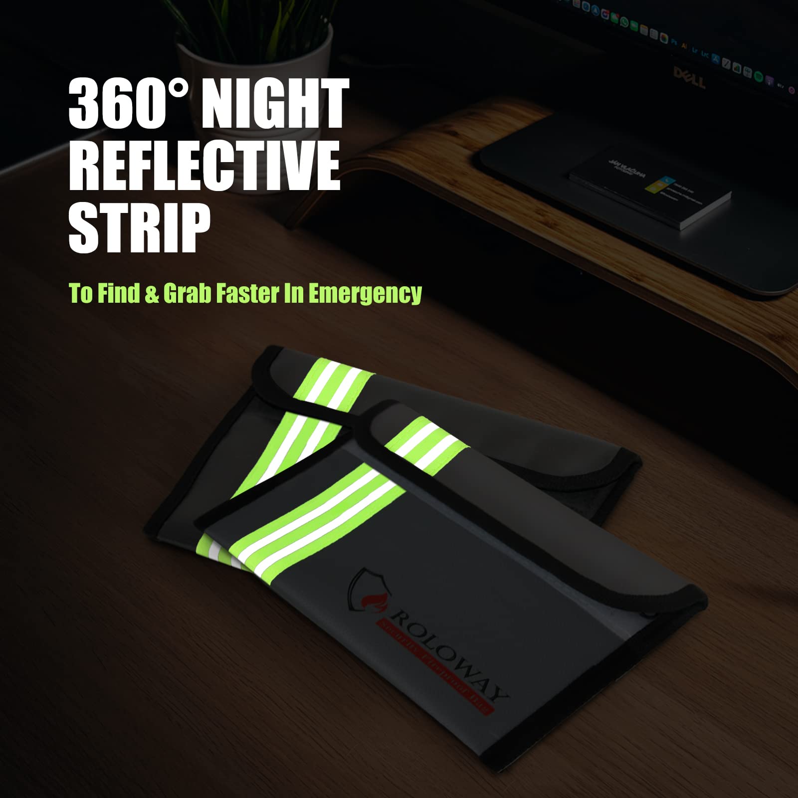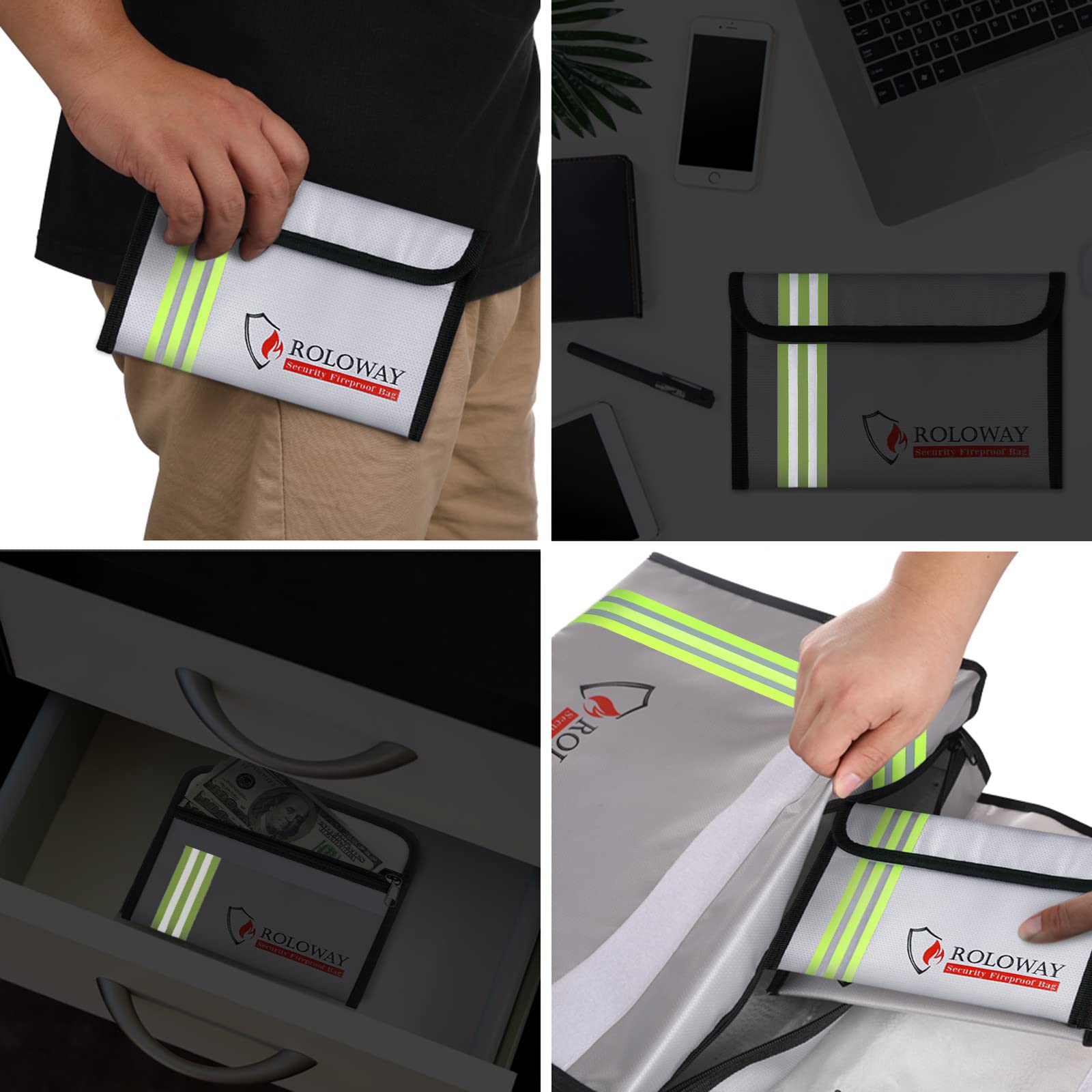 [NIGHT REFLECTIVE STRIP - FOR QUICK GRAB & GO]: In emergency, every minute counts. With the specifically designed Night Reflective Strip, you could find our fireproof bag for cash very soon even at night, which means you could find & take your most precious items in our fireproof bags much easier and quicker. Don't waste time trying to find your valuables in the dark. With the High Visibility Design, our fireproof money bag is great for Quick Grab & Go in emergency.