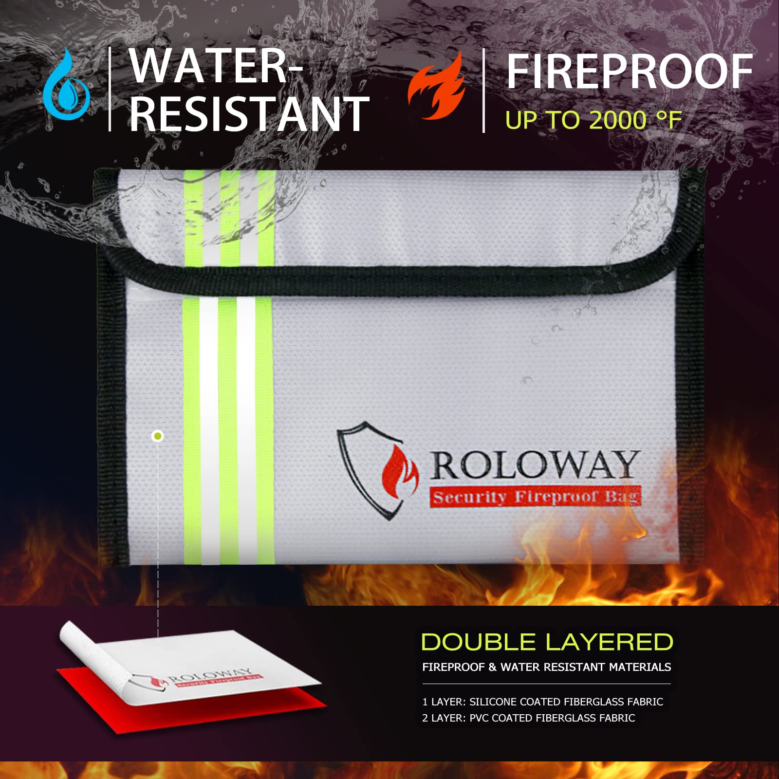 [FIREPROOF + UPGRADED WATER RESISTANT BAG - Protection in All Conditions] : With double layered FIBERGLASS, our Fireproof Money Bags Silver can withstand temperatures as high as 2000 F in certain times (UL94 VTM-0 Certified). Meantime, the WATERPROOF ZIPPER + SILICONE COATED layers + HOOK & LOOP CLOSURE bring great water protection. Our fireproof bags perform reliable in ALL weather conditions. Suitable for indoors, outdoors, travel, camping, and EMERGENCY PREPARATION.