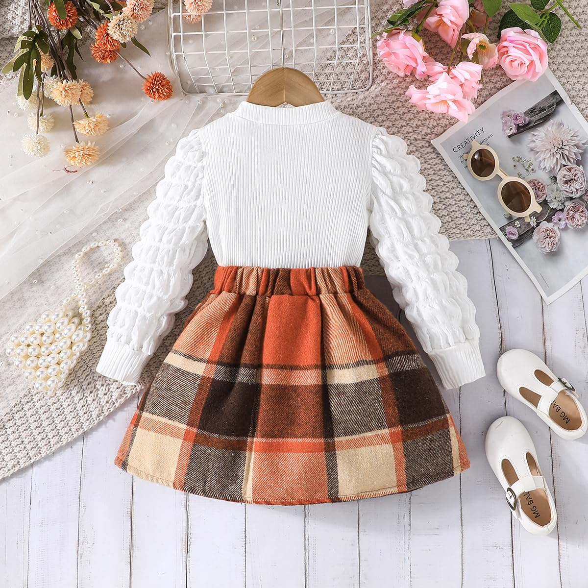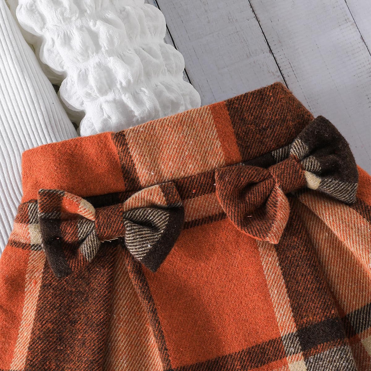 Feature: Baby girl fall outfits,cute lantern puff sleeve, classic vintage brown plaid Skirtcomfy ribbed shirt and tweed plaid skirt set, girls plaid skirt with delicate bowknot decoration,lovely and stylish, Suitable for your little princess in autumn winter and Christmas wear.