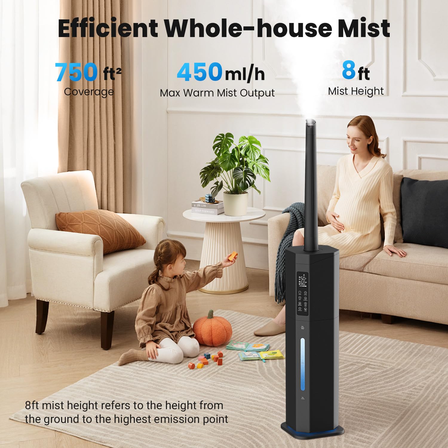๐ฌ๐๐๐๐๐๐๐๐ 750 ๐๐ ๐๐ ๐ช๐๐๐๐๐๐๐: Features 3 adjustable mist levels (max warm mist output: 450mL/h), this top-fill air humidifier runs up to 60 hours on a single fill (Lowest cool mist level), minimizing hassle. Enjoy healthier air across spaces up to 750 sq ft โ perfect for nurseries, bedrooms, living rooms,home, commercial, offices, greenhouses and plant