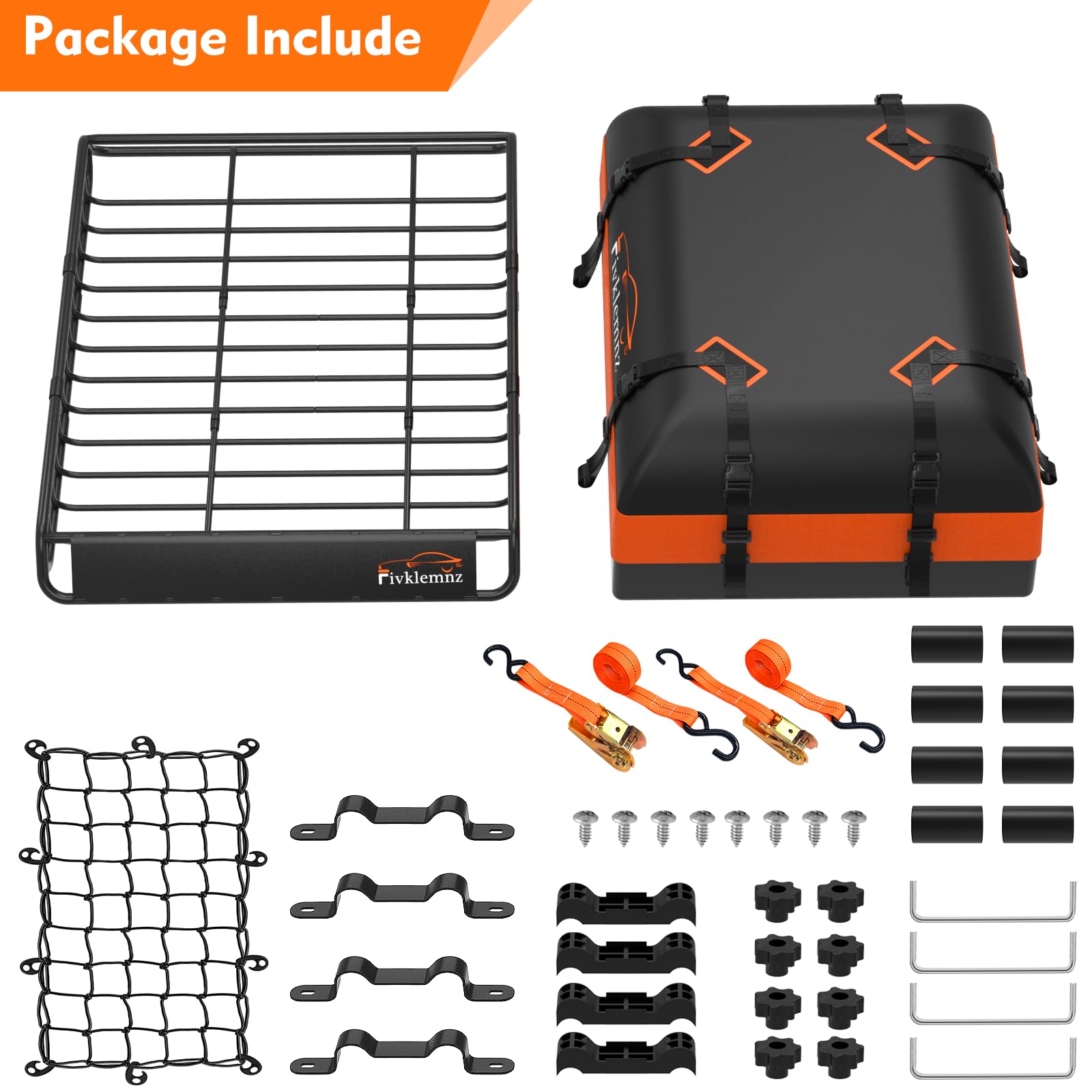 Roof Rack Cargo Carrier, Universal Roof Basket (51"x 36"x 5") + 15 Cubic Feet Waterproof Rooftop Cargo Carrier Bag (46"x 34"x 17") with Bungee Net, Ratchet Straps, Storage Bag, Luggage Lock