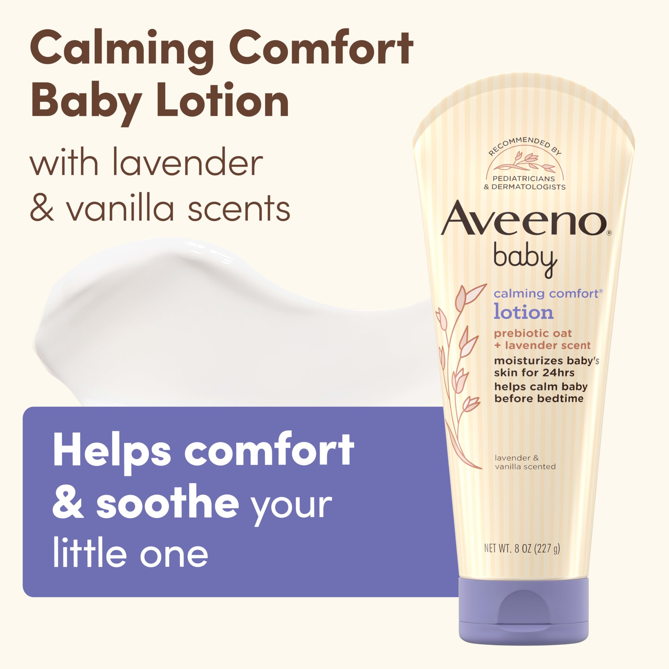 SOOTHING BABY LOTION: 8-fluid ounces of Aveeno Baby Calming Comfort Moisturizing Body Lotion with relaxing lavender and vanilla scents to help comfort and soothe your little one at bedtime
