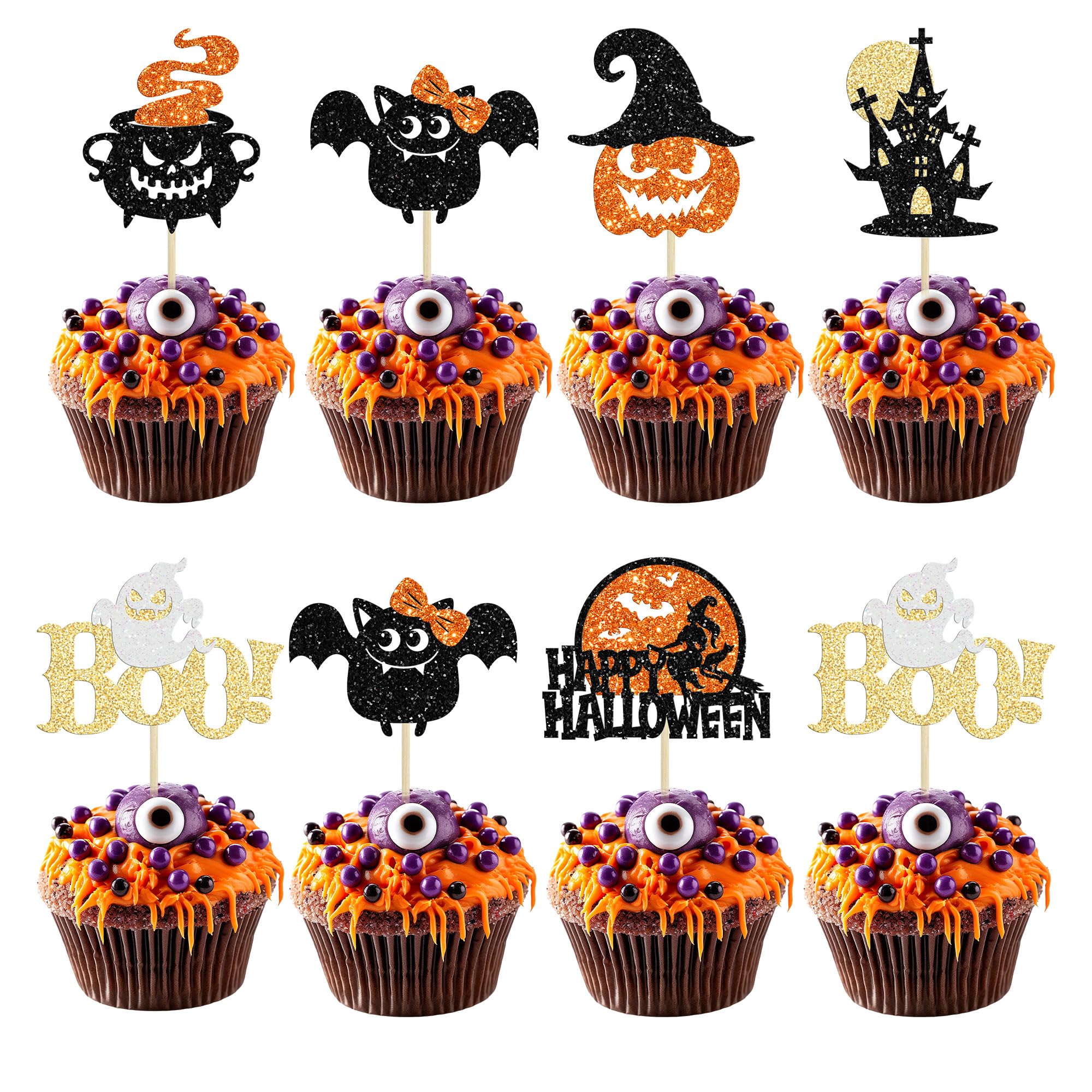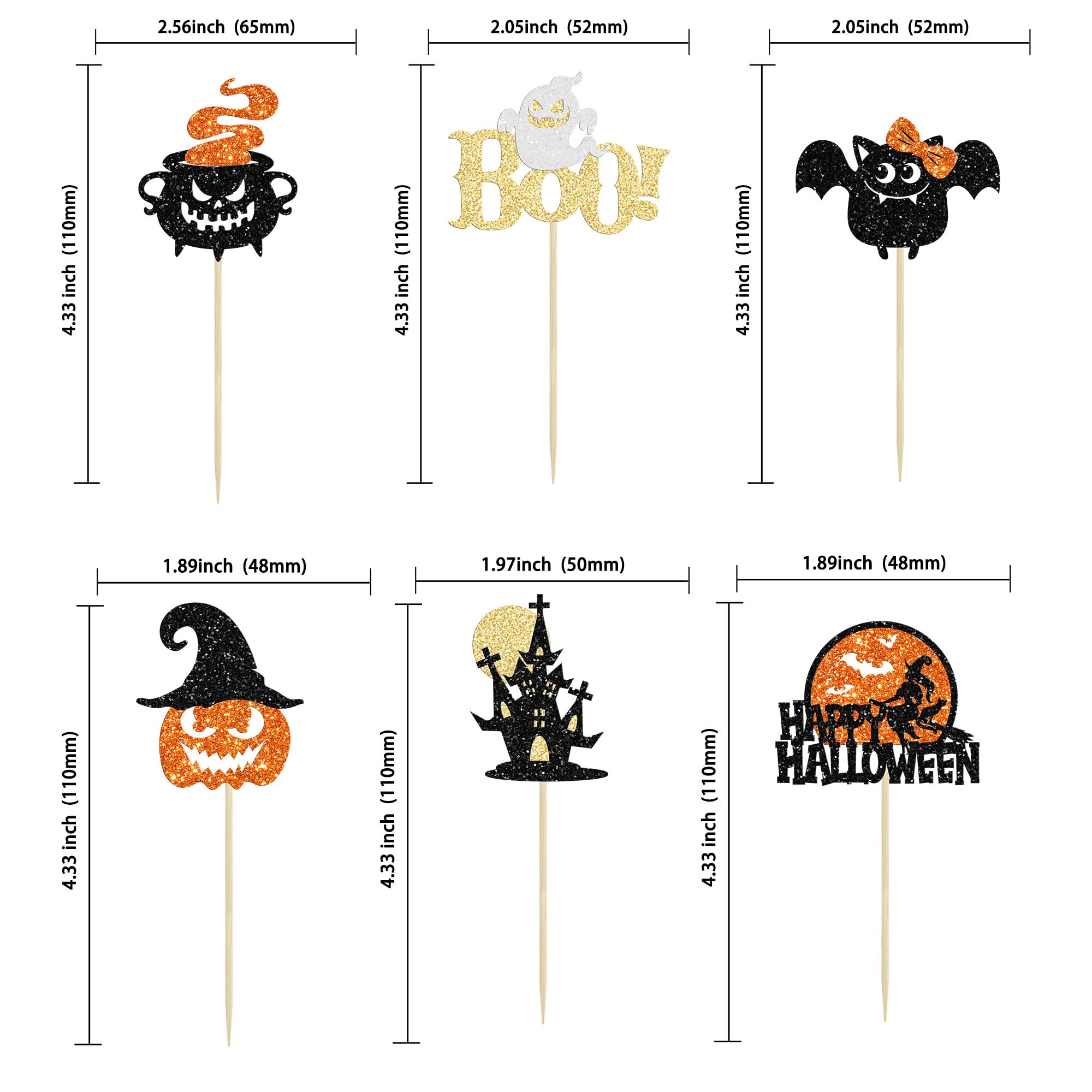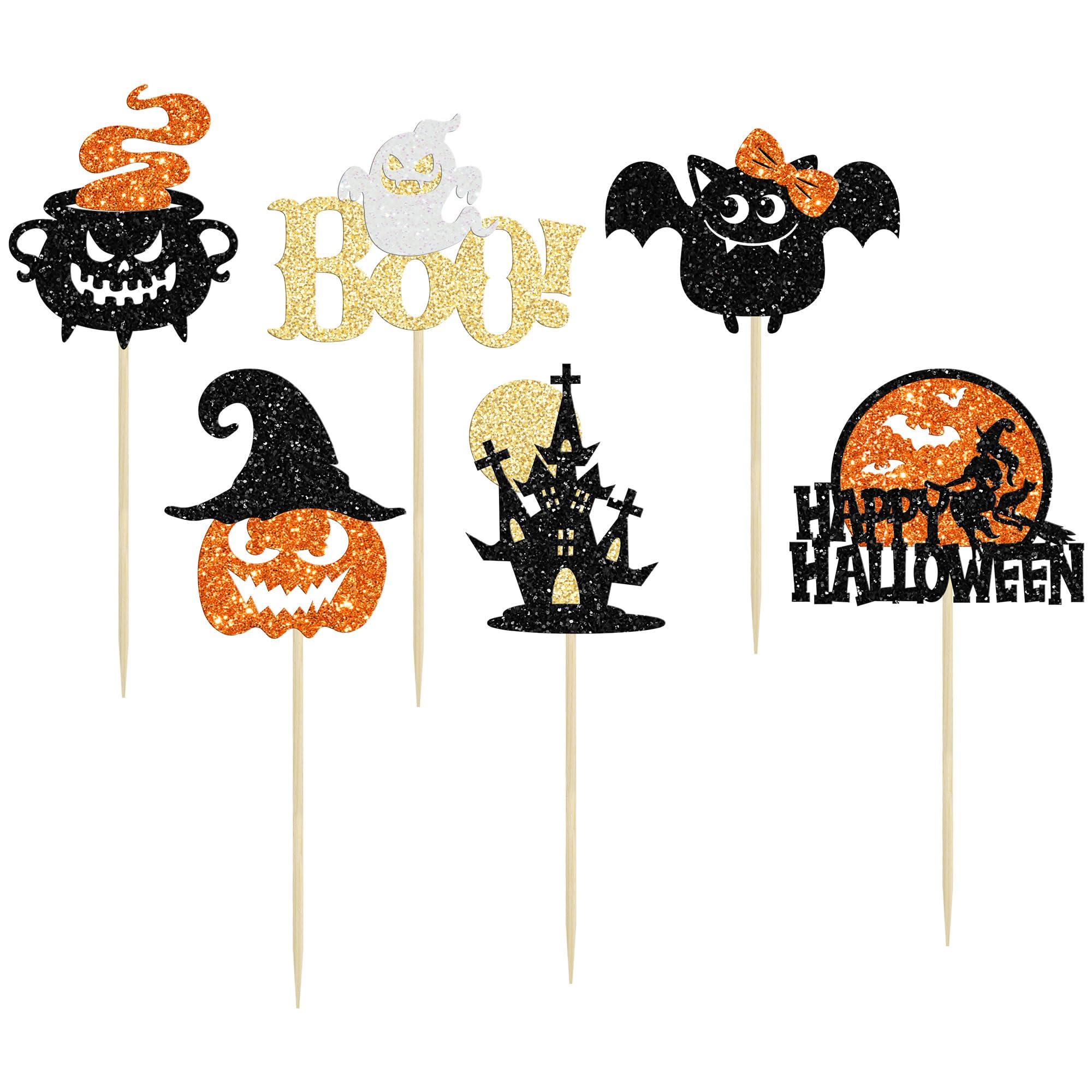 【Upgrade Quality】: 24Pcs Happy Halloween Cupcake Toppers are made of 300 gram glitter card stock and 100% food grade bamboo stick, not easy to deform and fade, smooth edges without burrs, makes these Halloween Cupcake Toppers give you a wonderful visual enjoyment. It is durable enough for long lasting use.