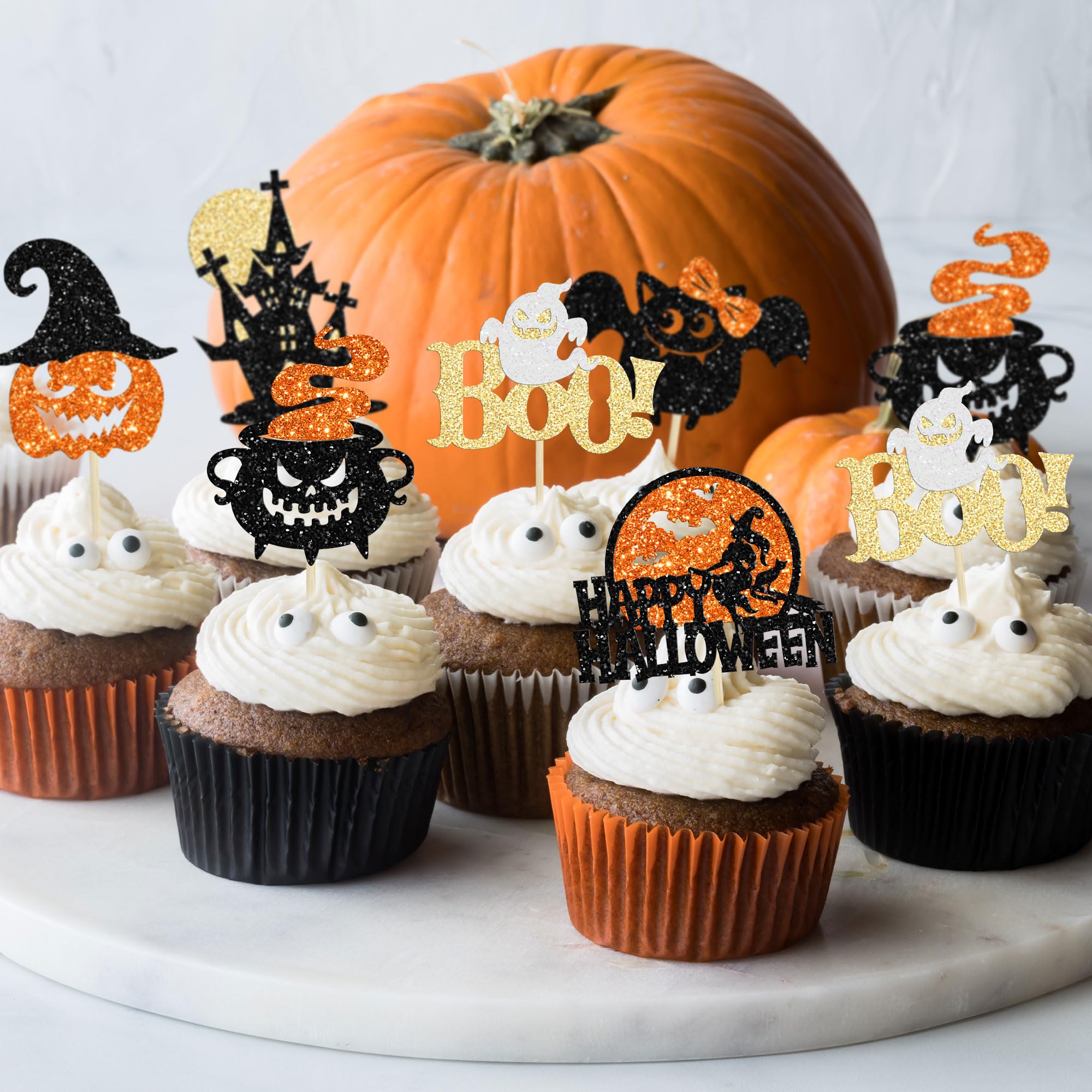 【Halloween Party Supplies】: 24Pcs Happy Halloween Cupcake Toppers are perfect for Halloween theme party, Halloween Ghost Theme baby shower party, celebrating Halloween Ghost birthday cake decorations supplies, they will make your cupcake more attractive and bring the fun to your party, make your guests fall in love with them!