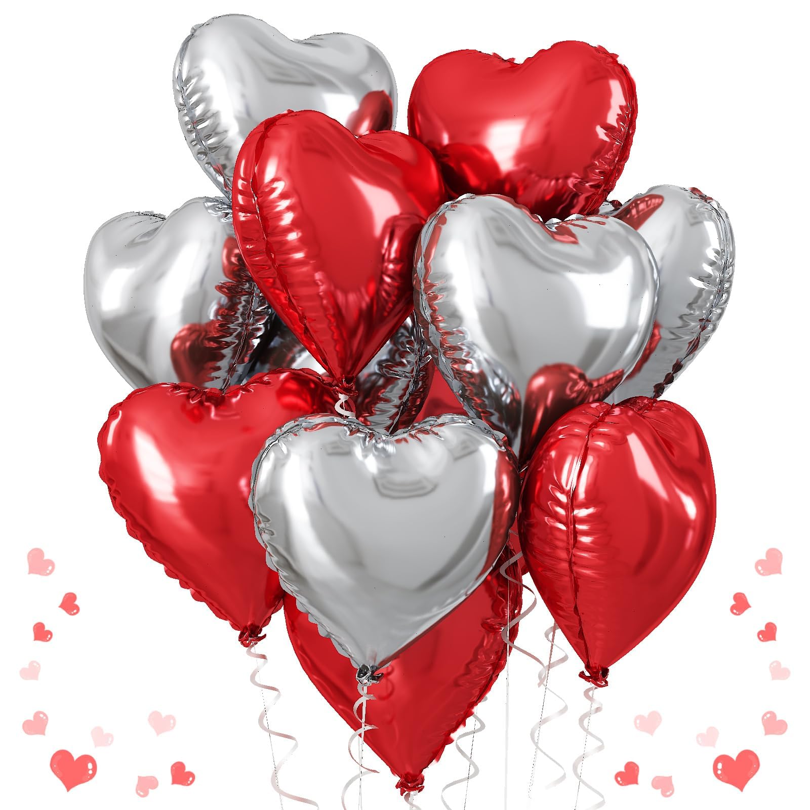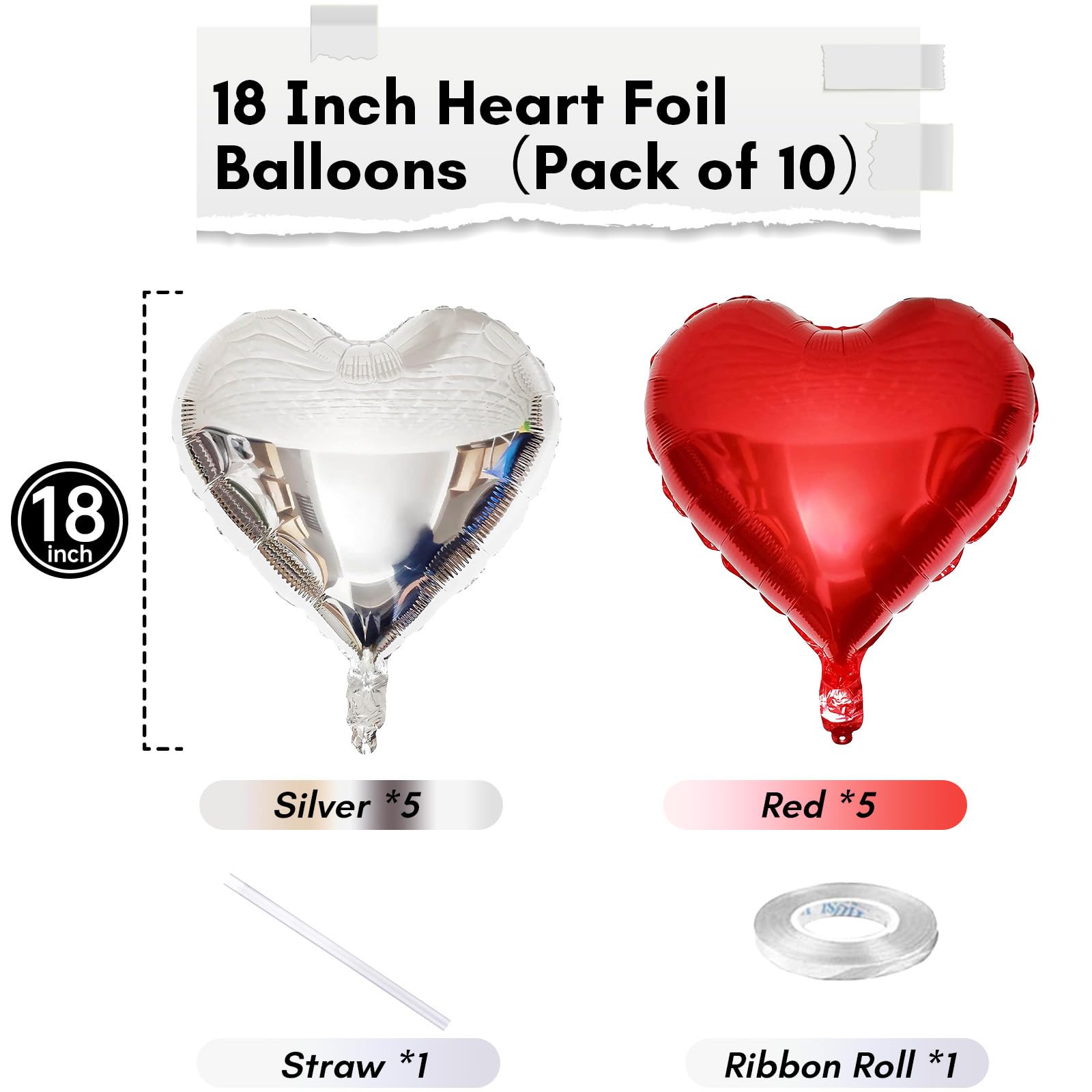 Red Silver Heart Balloons: 10pcs 18 inch heart foil balloons , Includes 5pcs 18 inch red heart foil balloons, 5pcs 18inch silver heart foil balloons and 1pc ribbons.
