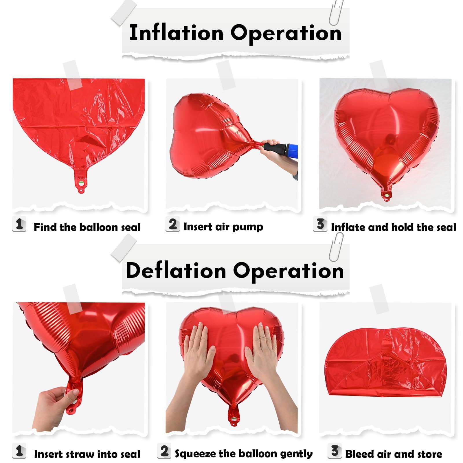 Easy to Use: The heart foil can inflate with helium or air, can be self-sealed. It is recommended to inflate to 90% to prevent the balloon from bursting.
