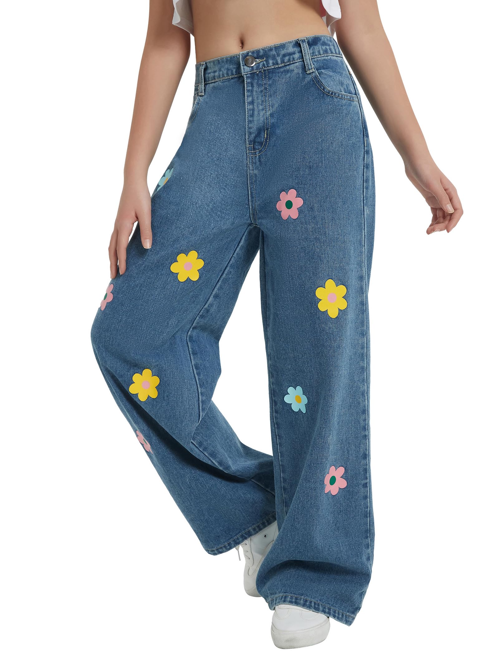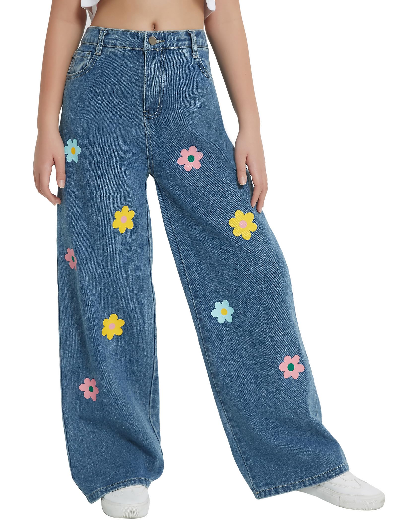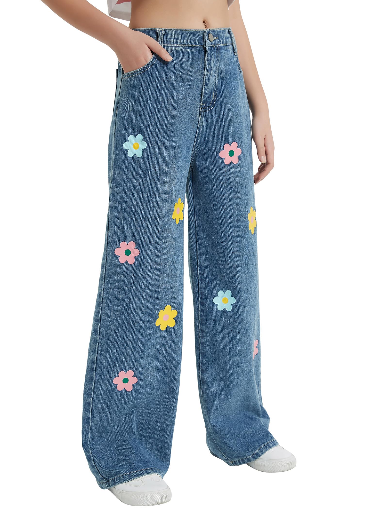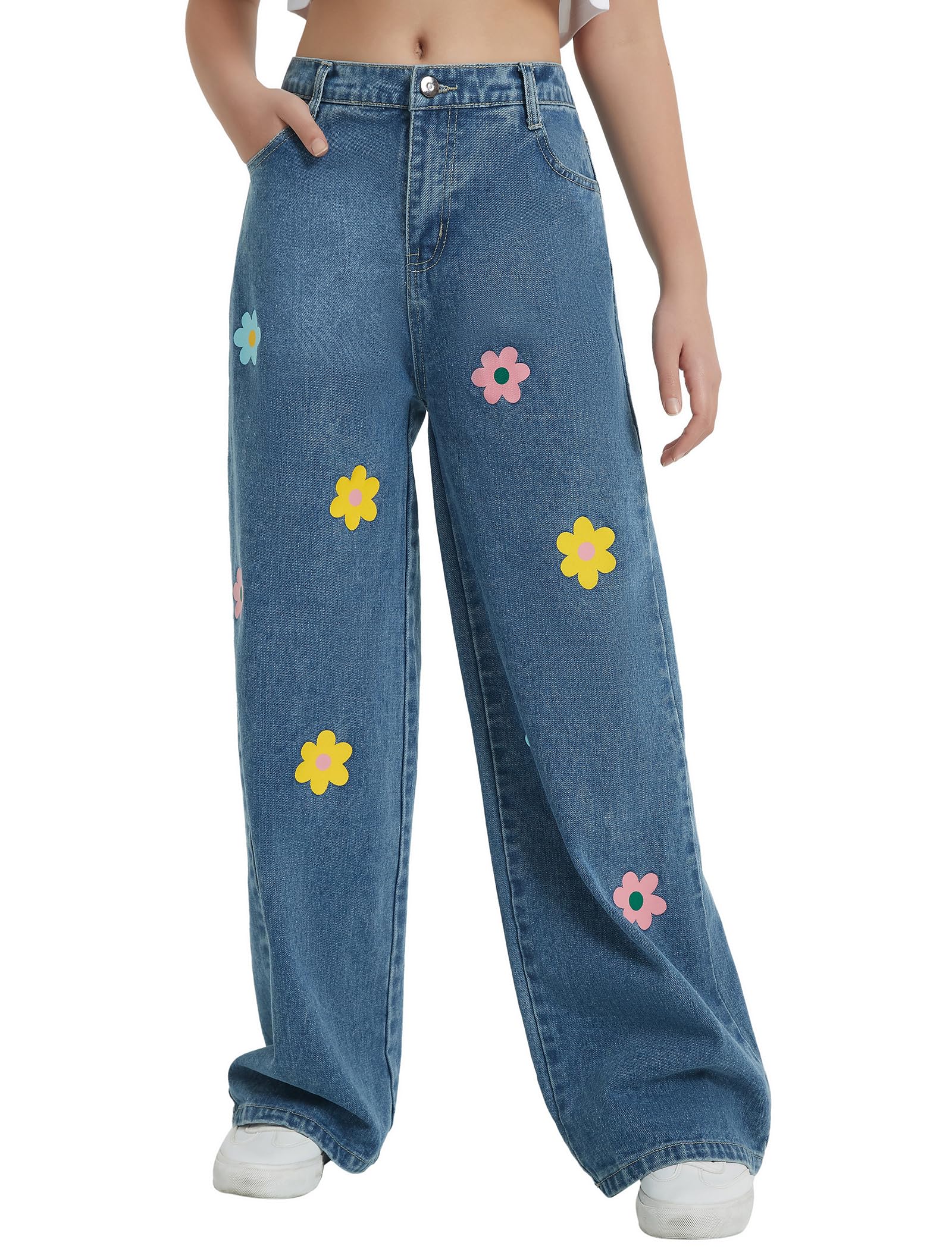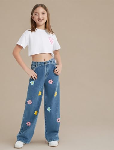 Floral Printed Jeans: Girl's wide leg pants have a fluid silhouette and an elasticized waist. The high waisted relaxed fit allows girls of all shapes and sizes, and the ankle length accentuates the curves of the legs