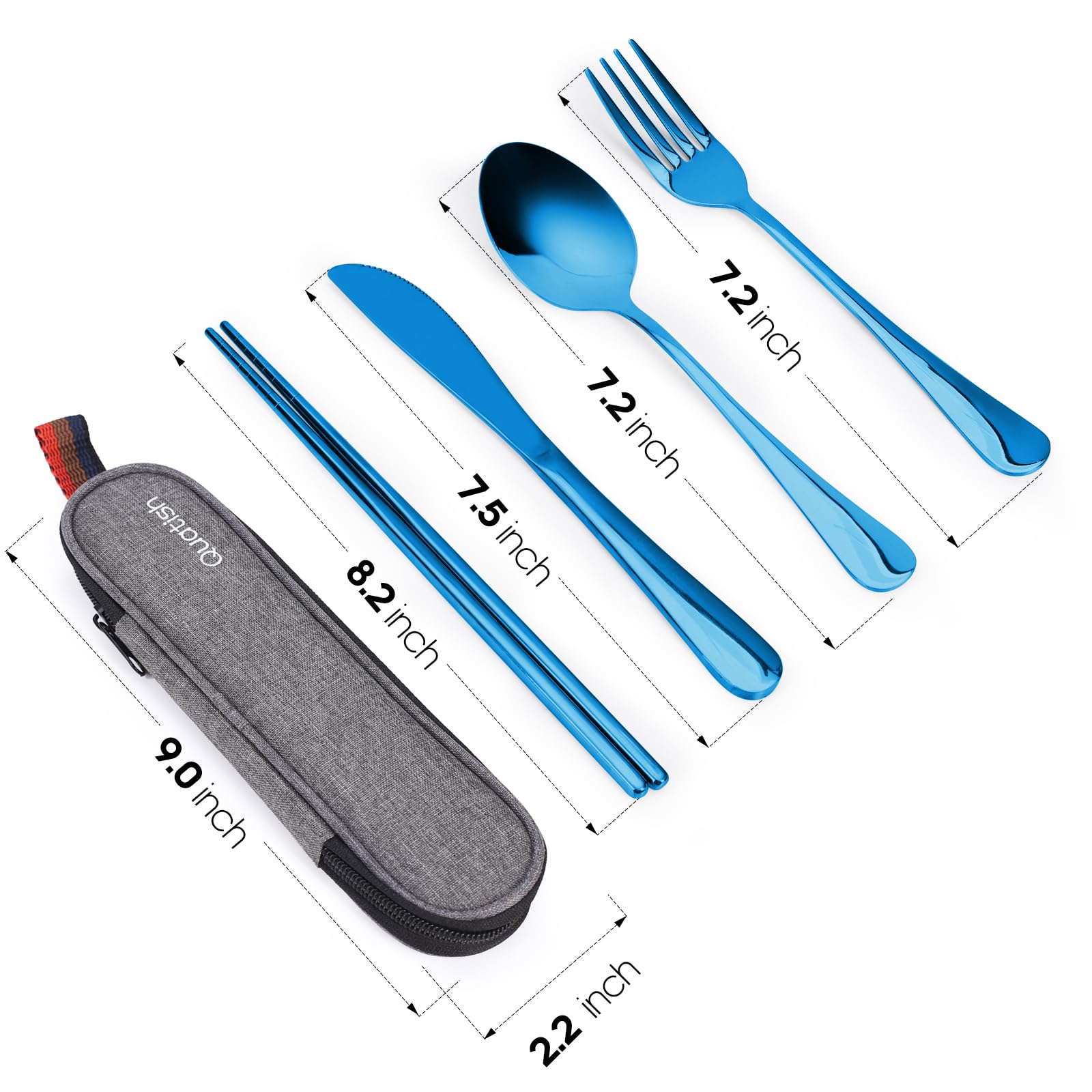 5 PCS Utensils Set: The minimalist set comes with an adult-sized fork, spoon, knife, chopsticks, and carrying case. The chopsticks are desighed with reinforced laser etching, for better anti-slip and grab the food