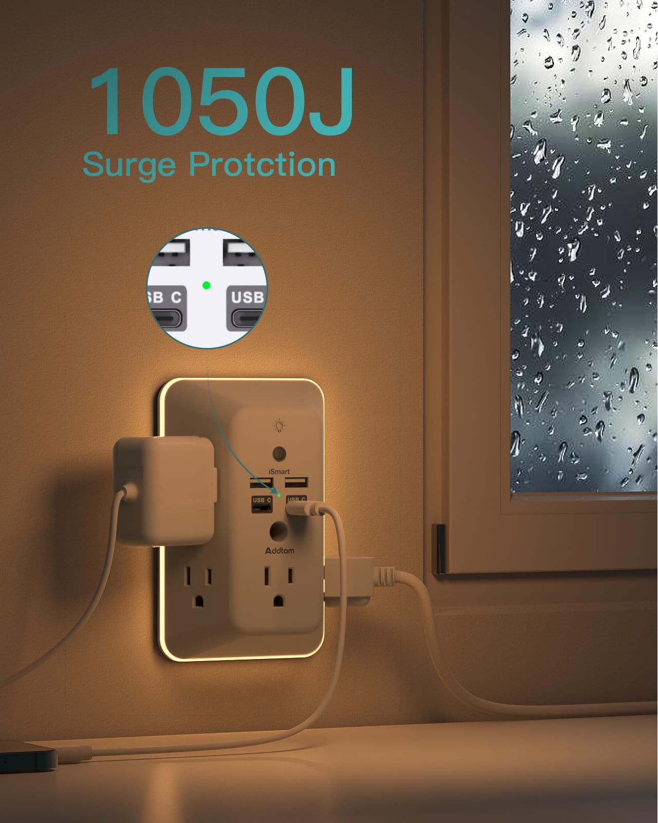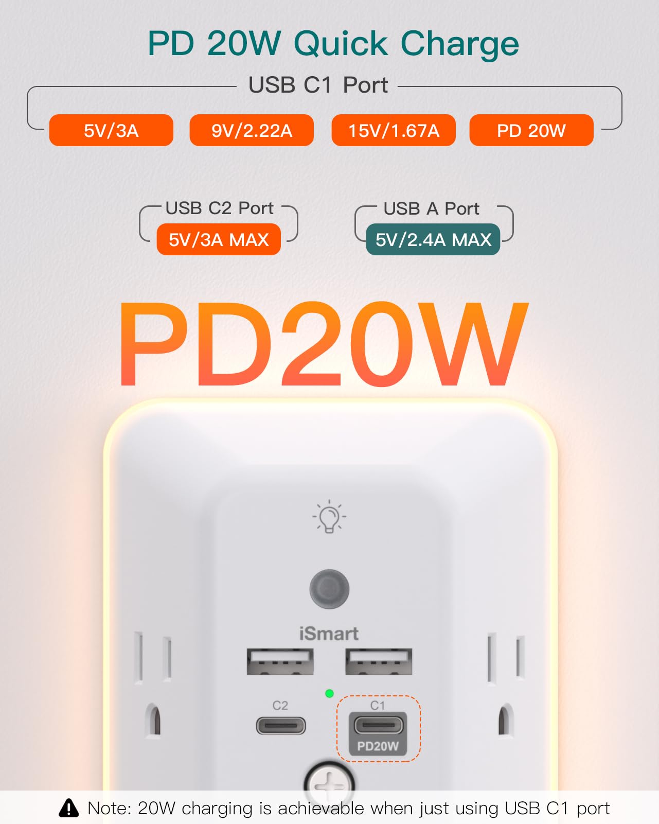【9 IN 1 USB Wall Outlet】You get 4 USB charging ports (PD 20W) and 5 wide-spaced outlets; 3 side design plug extender provides large space; LED night light around the edge of the outlet extender makes life more convenient; removable screw and the plastic prong make it firmly attached to the outlets