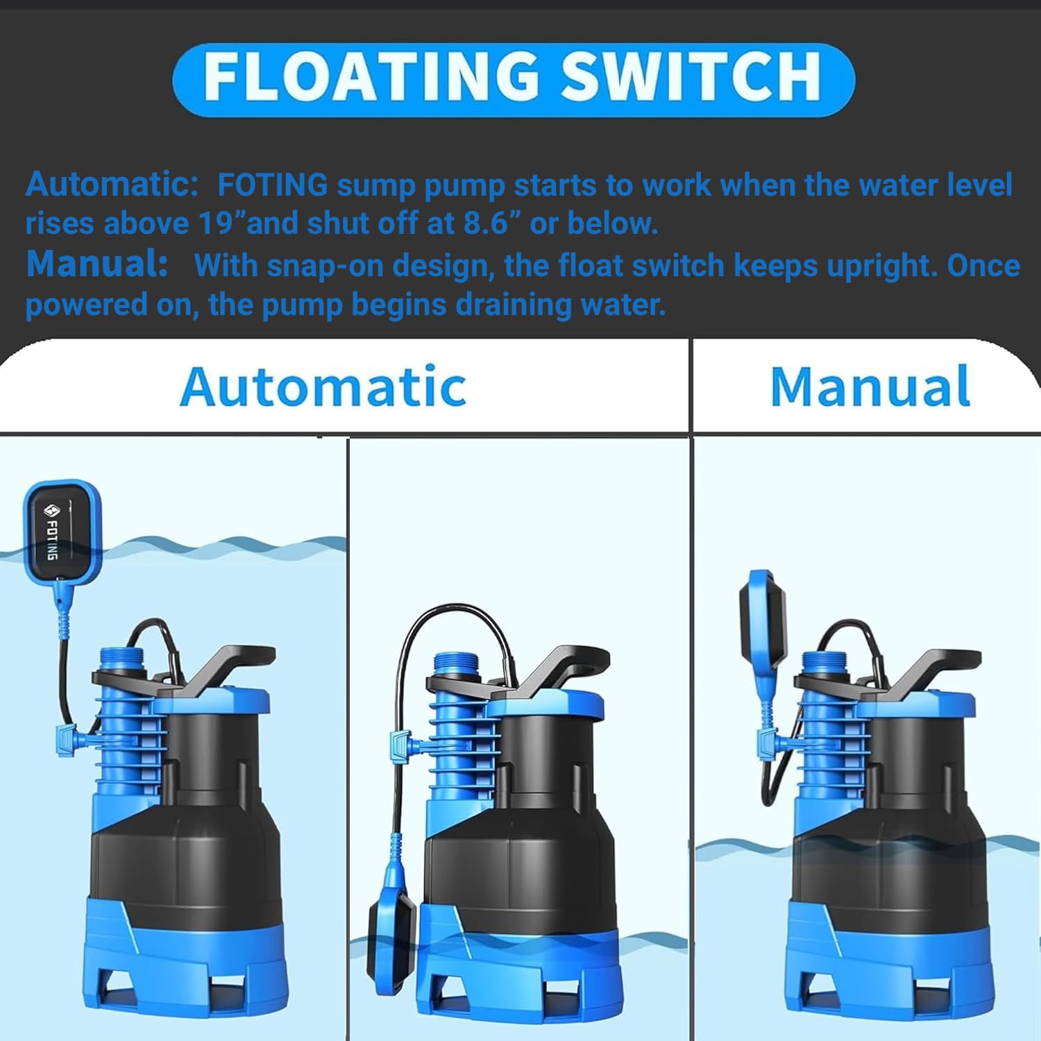 【Automatic & Manual Operation】Buckle design of float switch can keep the floater uplifted for permanently working until plug off, or clamp to pump body for stable ON/OFF operating automatically. Submersible sump pump pass a maximum grain size of 1.38 inches
