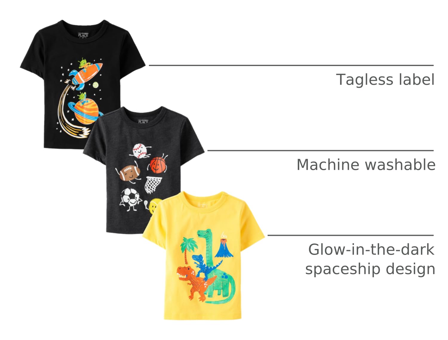MULTIPACK: 1 sport balls with happy faces graphic design, 1 dino graphic design, 1 glow-in-the-dark spaceship & planet graphic design; for best glow effect expose to light before wearing
