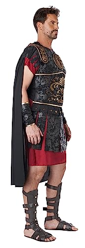 Description The Empire's strength is brave warriors. The Roman Warrior men's costume includes a red tunic top, a black and gold "armor' with attached cape, two Velcro stick on molded shoulder straps and a pair of wrist guards. Armor piece covers the front, and it ties around the back with a neck and a waist sash. Not included: sandals/shoes with shin straps, sword.