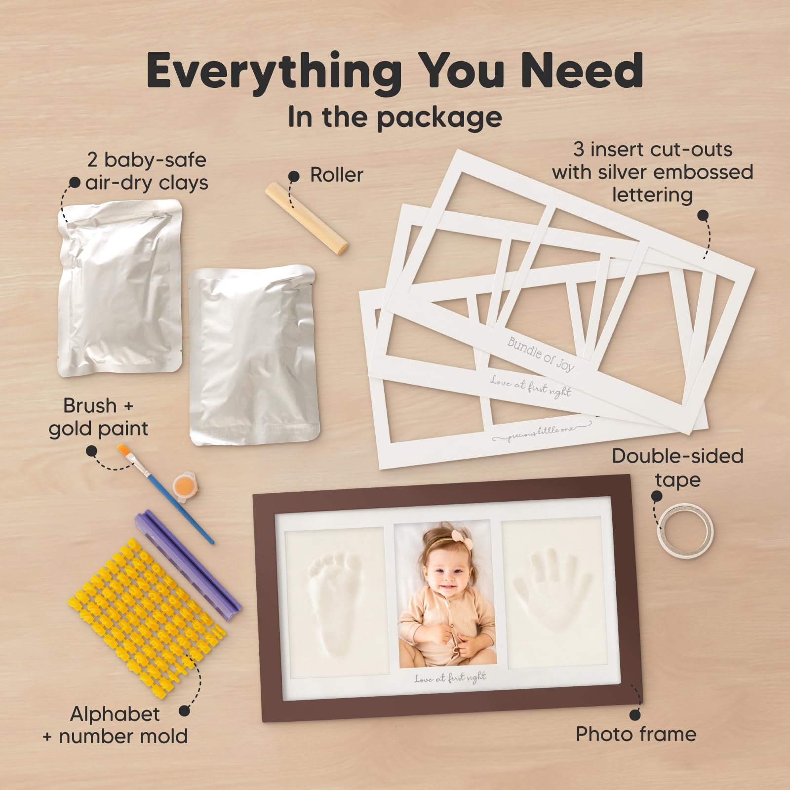 100% Safe Food-Grade Clay - Our baby picture frame features 100% baby-safe air-dry clay, perfect for preserving your baby prints. Our premium material ensures durability, the baby hand and footprint maker will look flawless for years to come.
