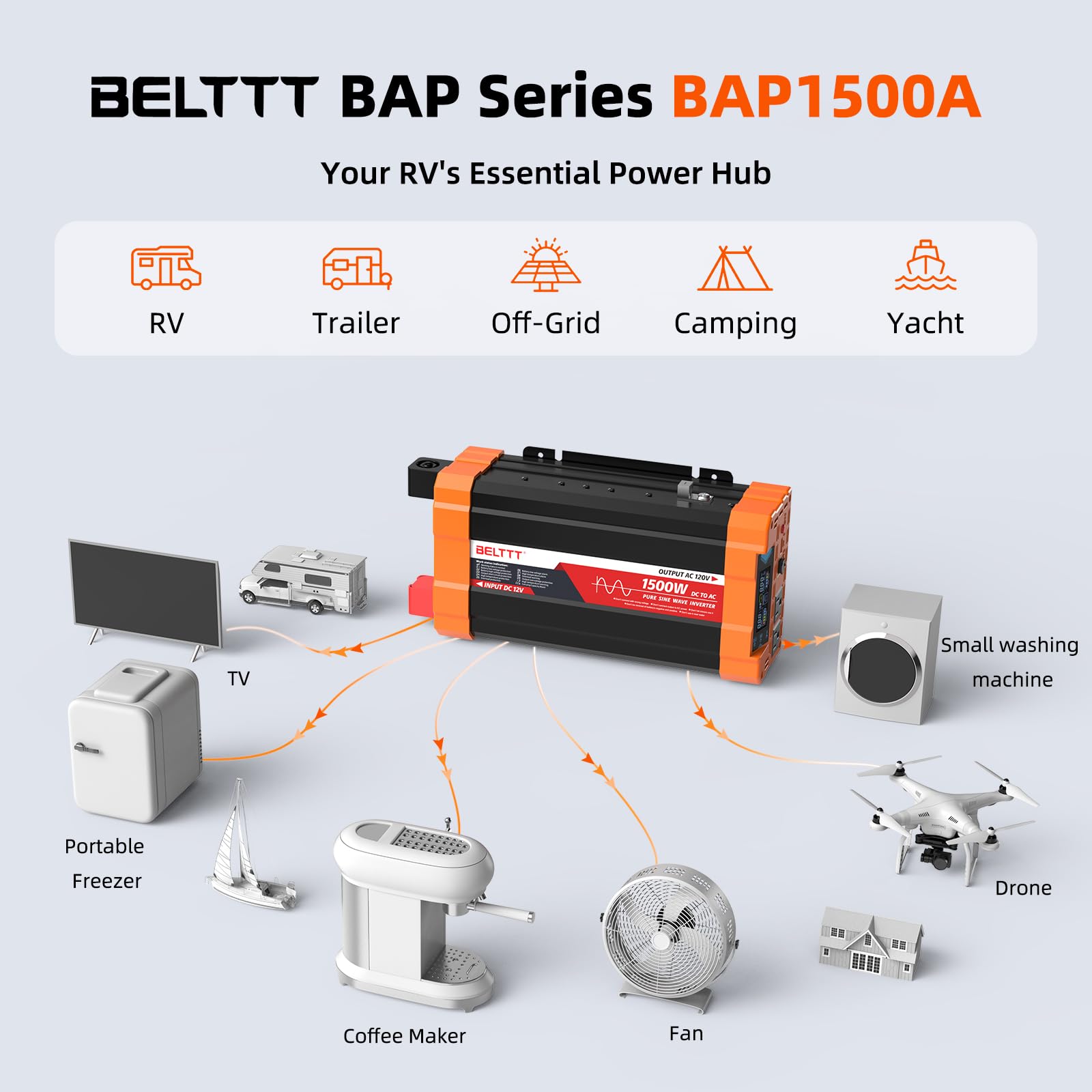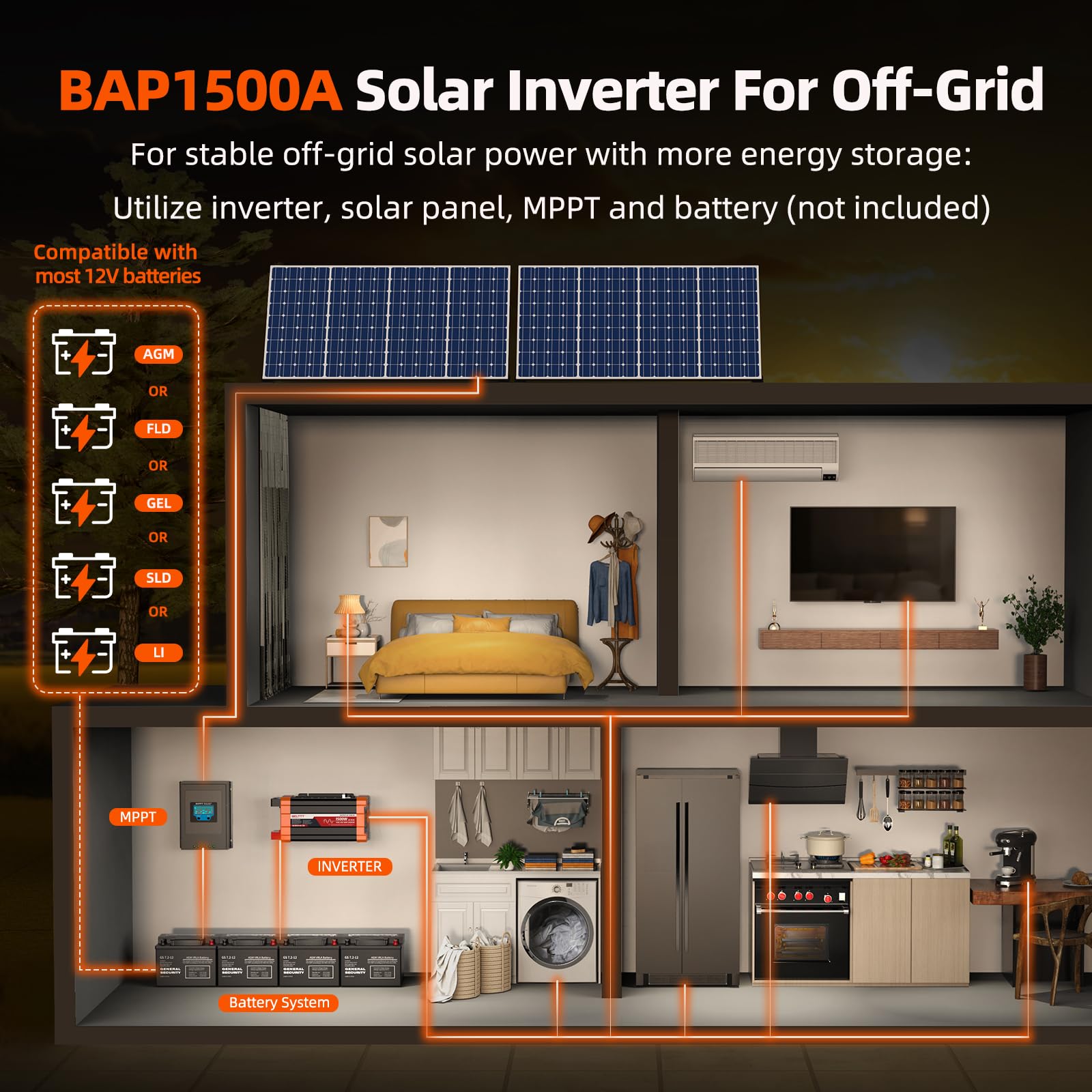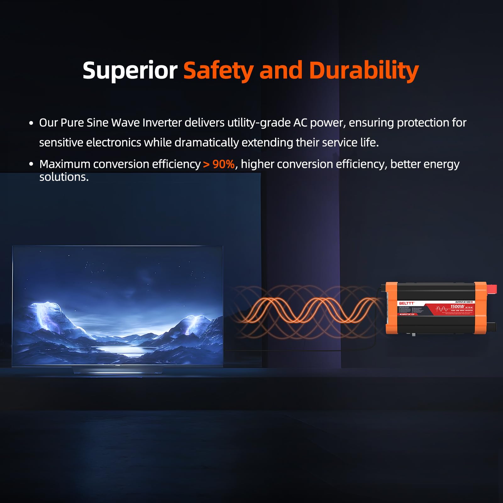 【INTELLIGENT LCD DISPLAY】: This 1500Watt inverter comes with a high-brightness real-time smart screen that simultaneously displays input and output voltages, battery and load status, multiple operating conditions for timely troubleshooting. At the same time, the output voltage and screen can be adjusted independently in a small range