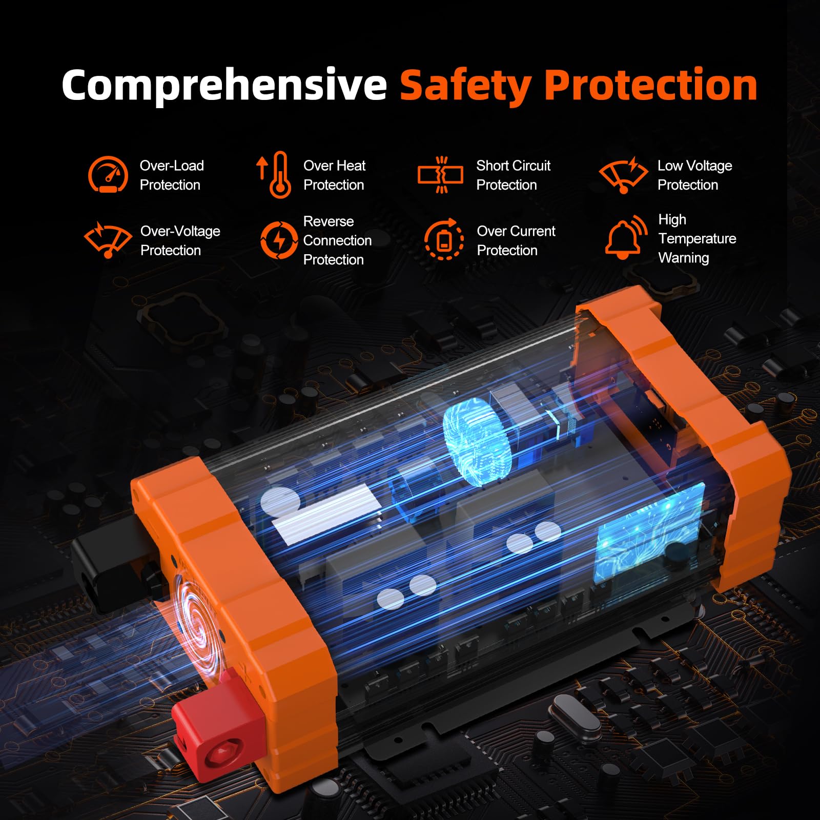 【MULTIPLE SAFETY PROTECTIONS】: Pure sine wave inverter provides undervoltage, overvoltage protection, overload, over temperature protection, short circuit and reverse connection protection. Aluminum and sturdy plastic housing ensures long term use