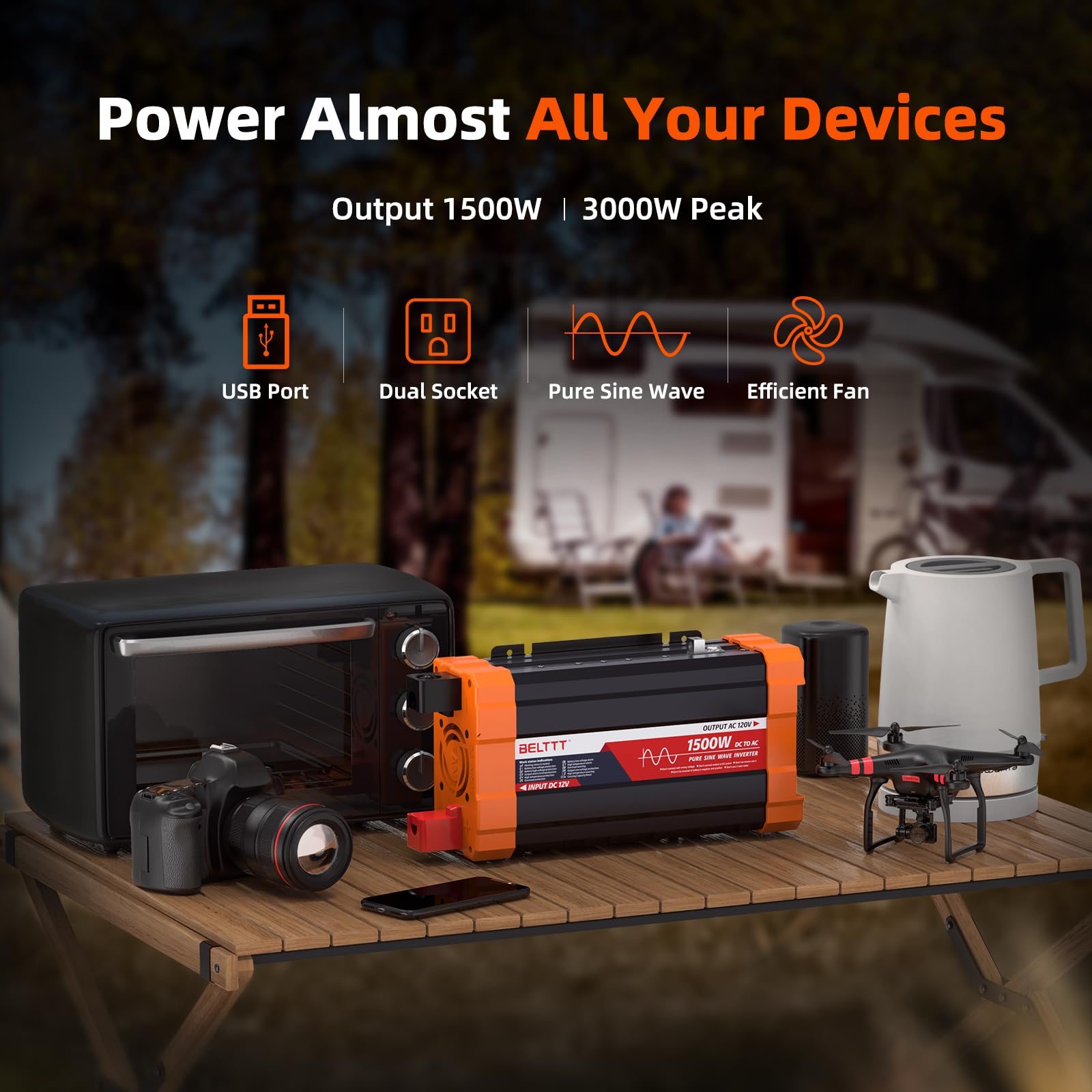 【POWERFUL DC to AC CONVERTER】: This car power inverter delivers 1500W of continuous DC 12V to AC 110V 120V power and up to 3000W of peak surge power when the load is started. The car inverter has a conversion efficiency of greater than 91% during normal working and low no-load losses