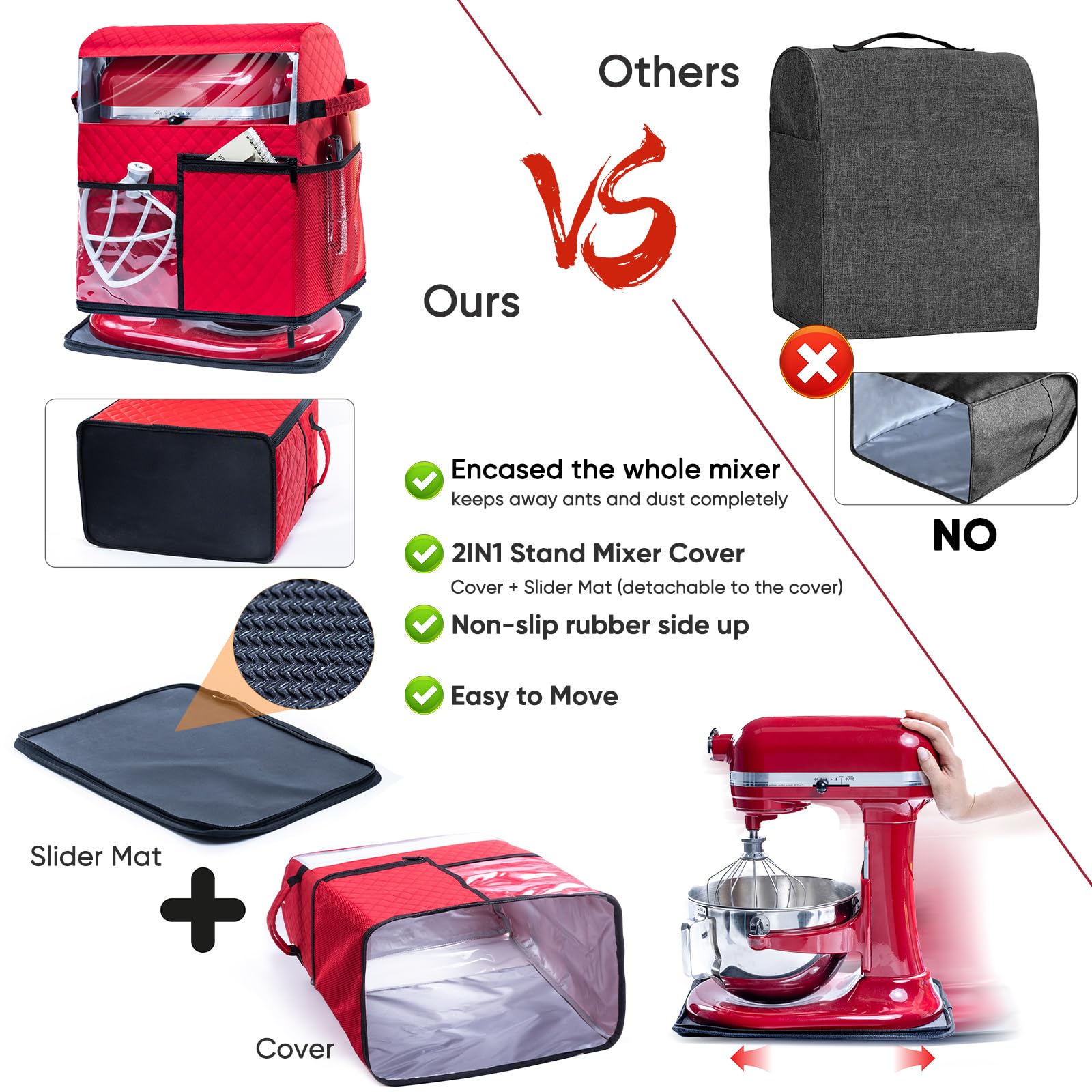 Encased The Whole Mixer - This mixer storage bag can encase the entire mixer, unlike covers without a bottom. It effectively keeps away ants and dust. It is pretty heavy to move the mixer, but the kitchen appliance slider on the base is specially designed to help move the heavy kitchen mixer quickly. (Patent Pending)