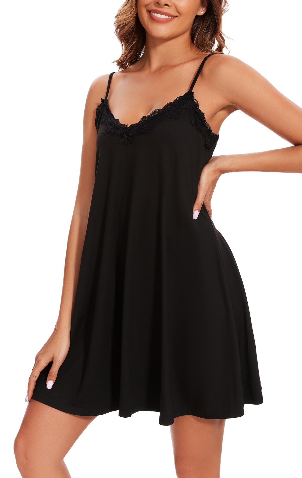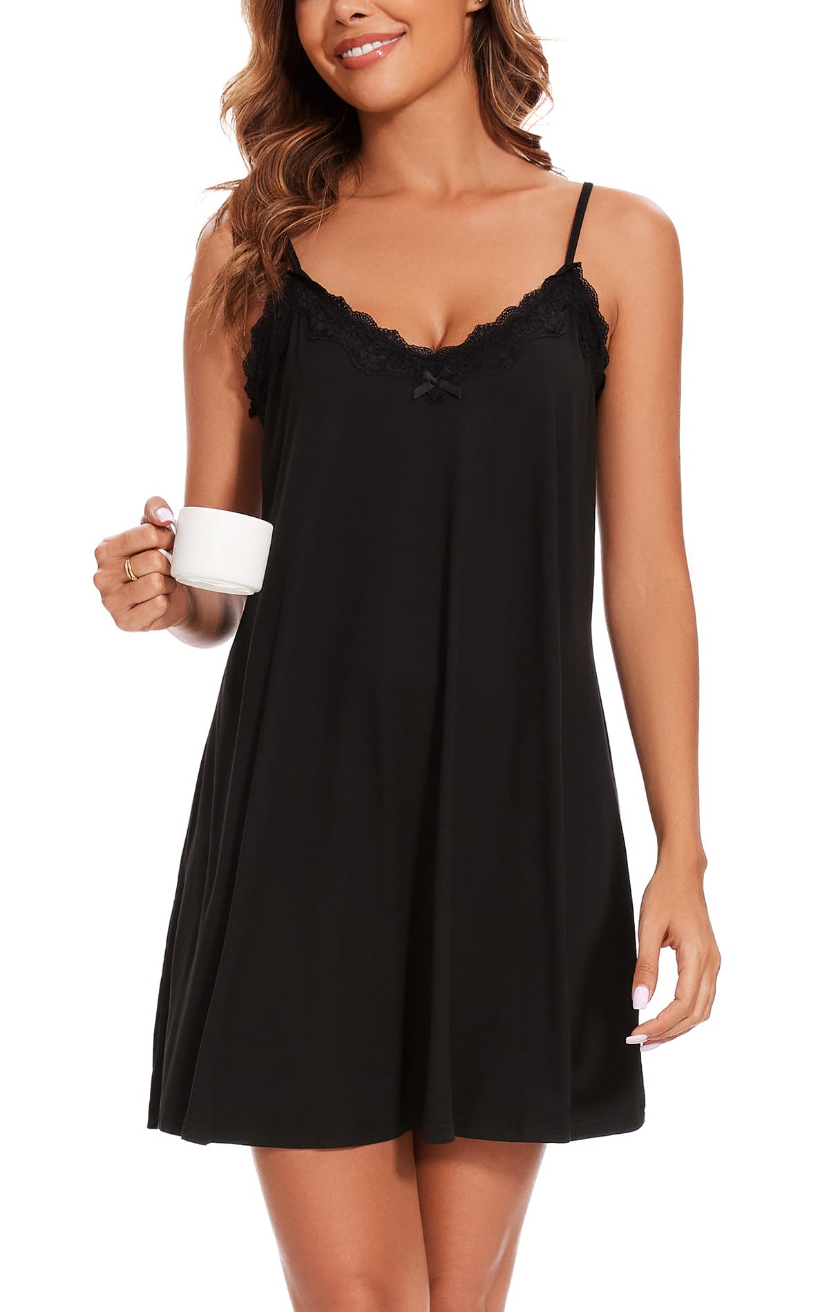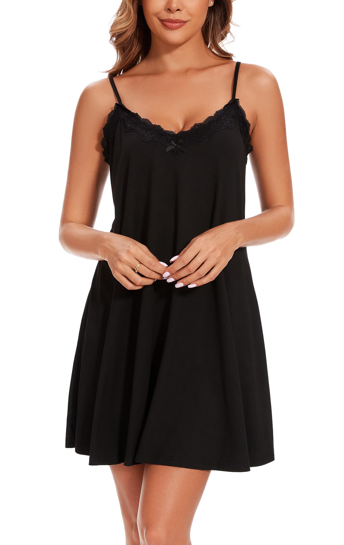 Design: Sexy nightgown featured as v neck and adjustable spaghetti straps, the lace and tiny bow add just enough feminine detail, it is super flowy and stretchy, soft and comfortable to sleep in and also cute to wear