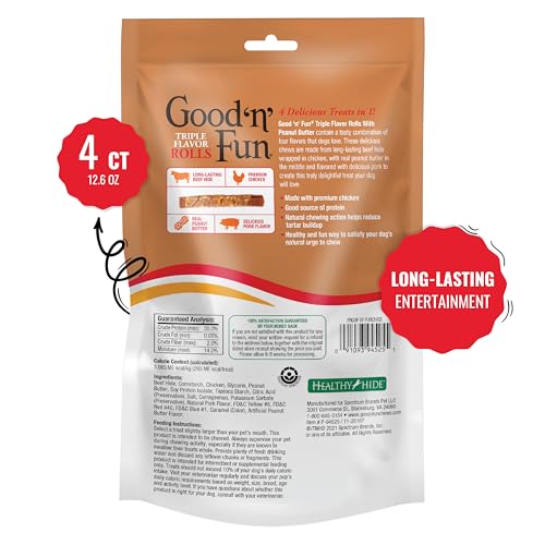 RAWHIDE CHEWS: Good ‘n’ Fun Triple Flavor Rolls are truly delightful, long-lasting rawhide chews your dog will love