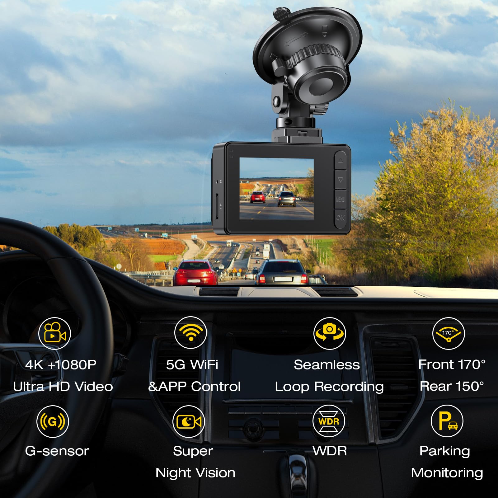 【True 4K + 1080P Dual Channel Recording & 170° Wide-Angle】The GOODTS dual dash cam front and rear captures ultra-crisp footage with Ultra HD 4K (3840*2160P) front camera and Full HD 1080P rear dashcam. Its 170°/150° ultra-wide angle lens minimizes blind spots, ensuring full coverage of road signs, license plates, and critical details during collisions. Ideal as a good 4K dash cam or car accessories , it safeguards evidence with unmatched clarity.