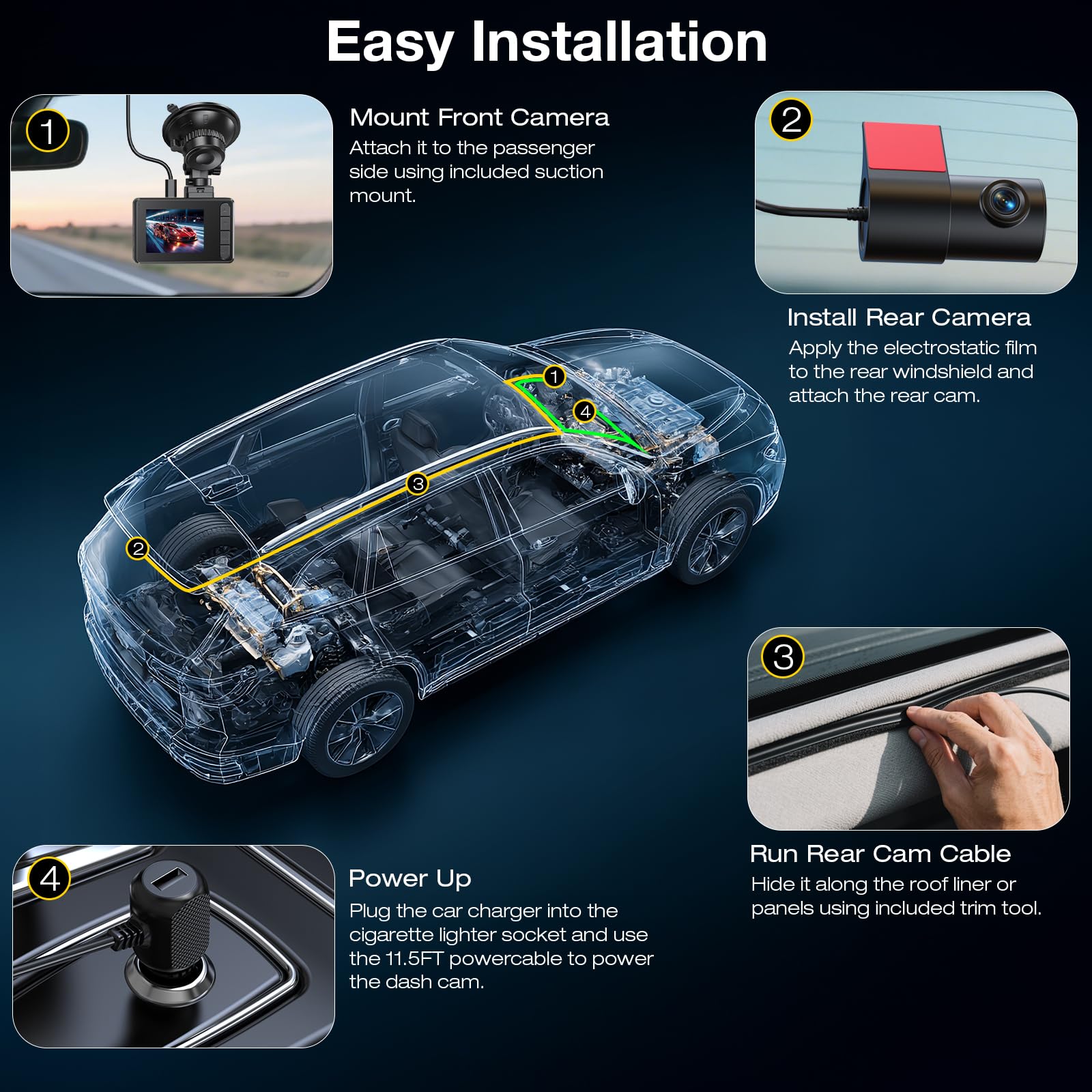 【Easy Installation& Guarantee】Experience easy installation and peace of mind with 360°dash cam front and rear . Mount the dashcams for cars on the windshield with the suction cup, hide the wiring with the included pry tool, and attach the rear camera to the window glass. GOODTS provides a 12-month extended guarantee and 24/7 customer support. Our dedicated aftersales team is always ready to assist you with any inquiries or concerns.