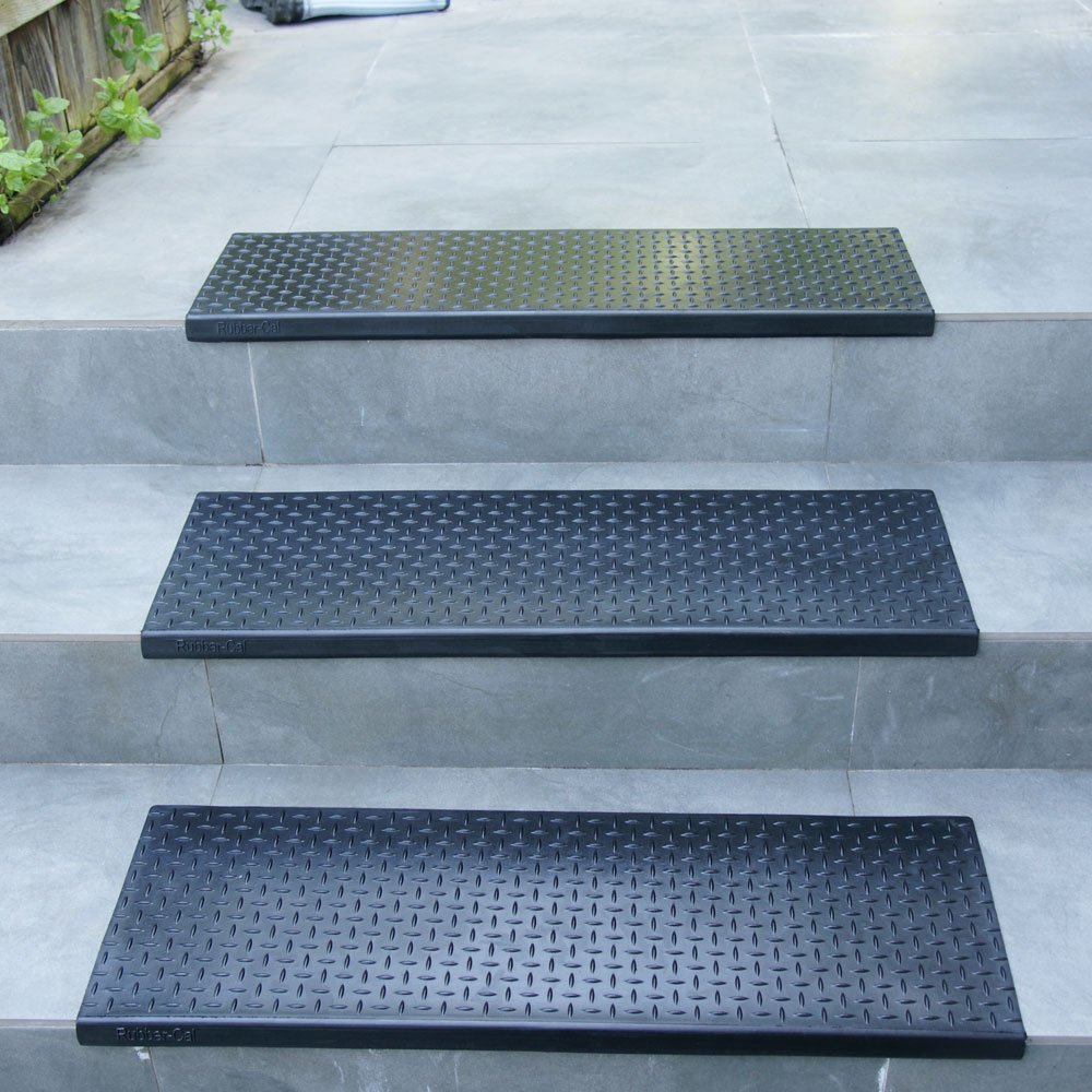 The Diamond-Plate rubber stair mats from Rubber-Cal are the perfect stairway safety solution for your stairways. These are eco-conscious products made from natural and reclaimed rubber materials. They have a uniquely industrial design that makes them an ideal fit for stairways in both commercial and industrial settings. The pattern is made up of slightly raised protrusions that are arranged in a layout specifically designed to improve grip for the feet on top of the mats. Stairs can be very dangerous areas and people often suffer terrible injuries resulting from falling on these paths. The "Diamond-Plate" stair treads will help to make stairways much safer places for both you and your guests to traverse. These are very durable non-slip stair treads that can handle high volumes of foot traffic. They will also serve to protect the wood, tile, or concrete surfaces of your steps from the kind of damage that is very expensive to repair.