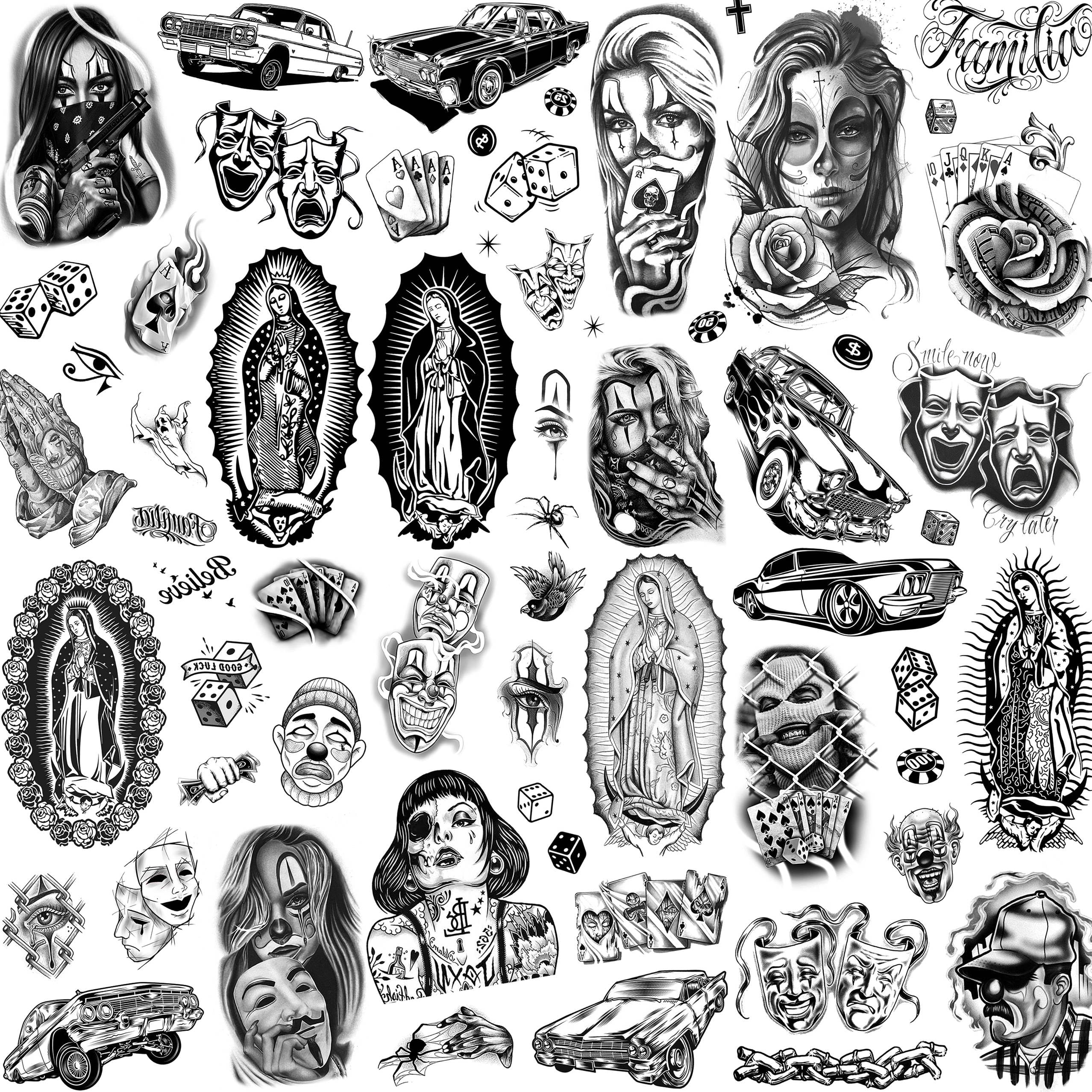 Gangsta Designs: Chicano art, crosses, tear drops, crowns, skulls, diamonds, clubs, spades, hearts and more.