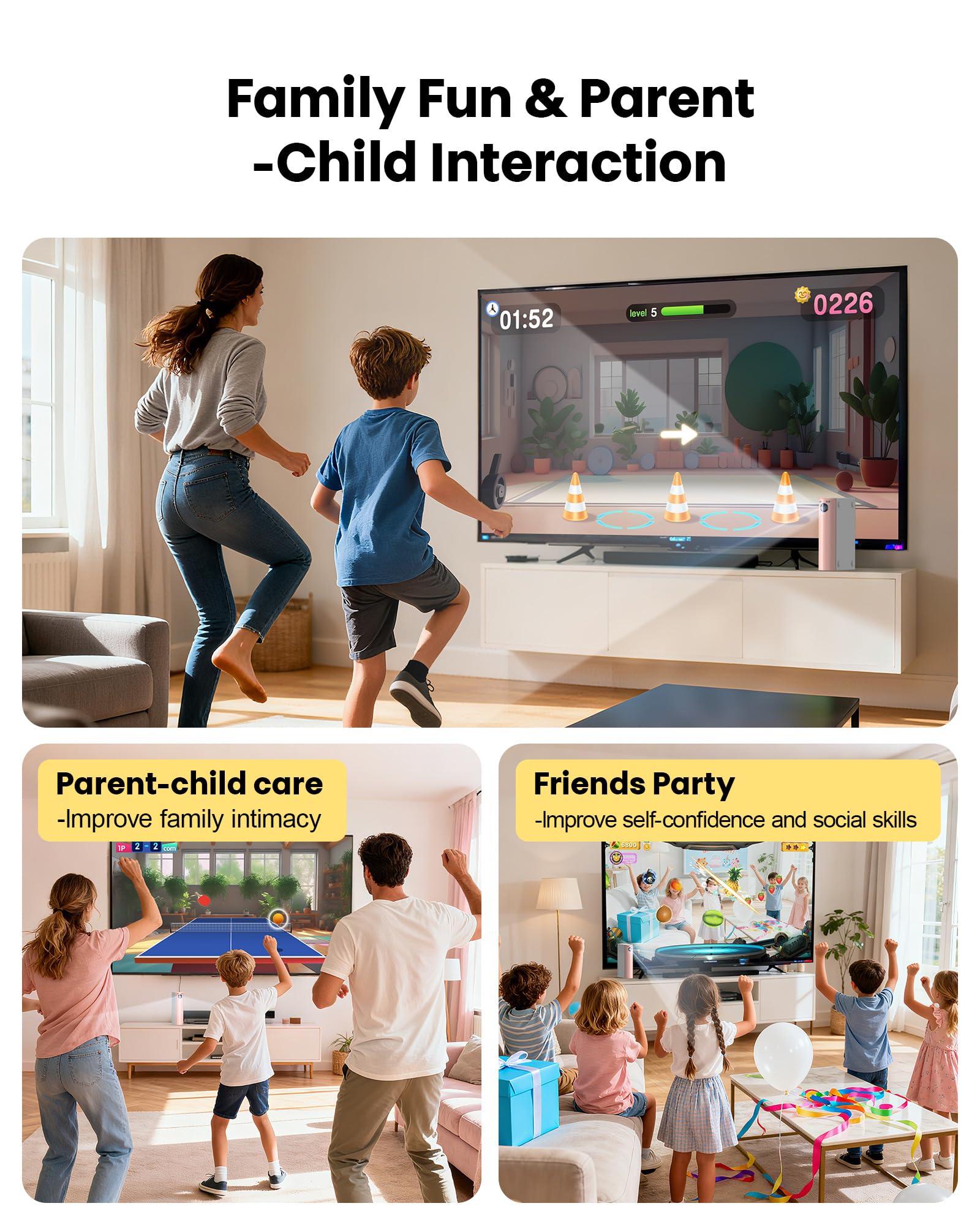 AR Motion Video Games: The AR camera can accurately capture your body movements in real-time, allowing you to move and play through natural body actions—instantly transforming your living room into the next playground or challenge arena. 28 Built-in Classic Games: Action, Puzzle, Classics—including Fruit Ninja, Ocean Adventure, Treythm Ball, and more. Bring family and friends closer through joyful gaming. This makes family game nights, playdates, and parties even more exciting.