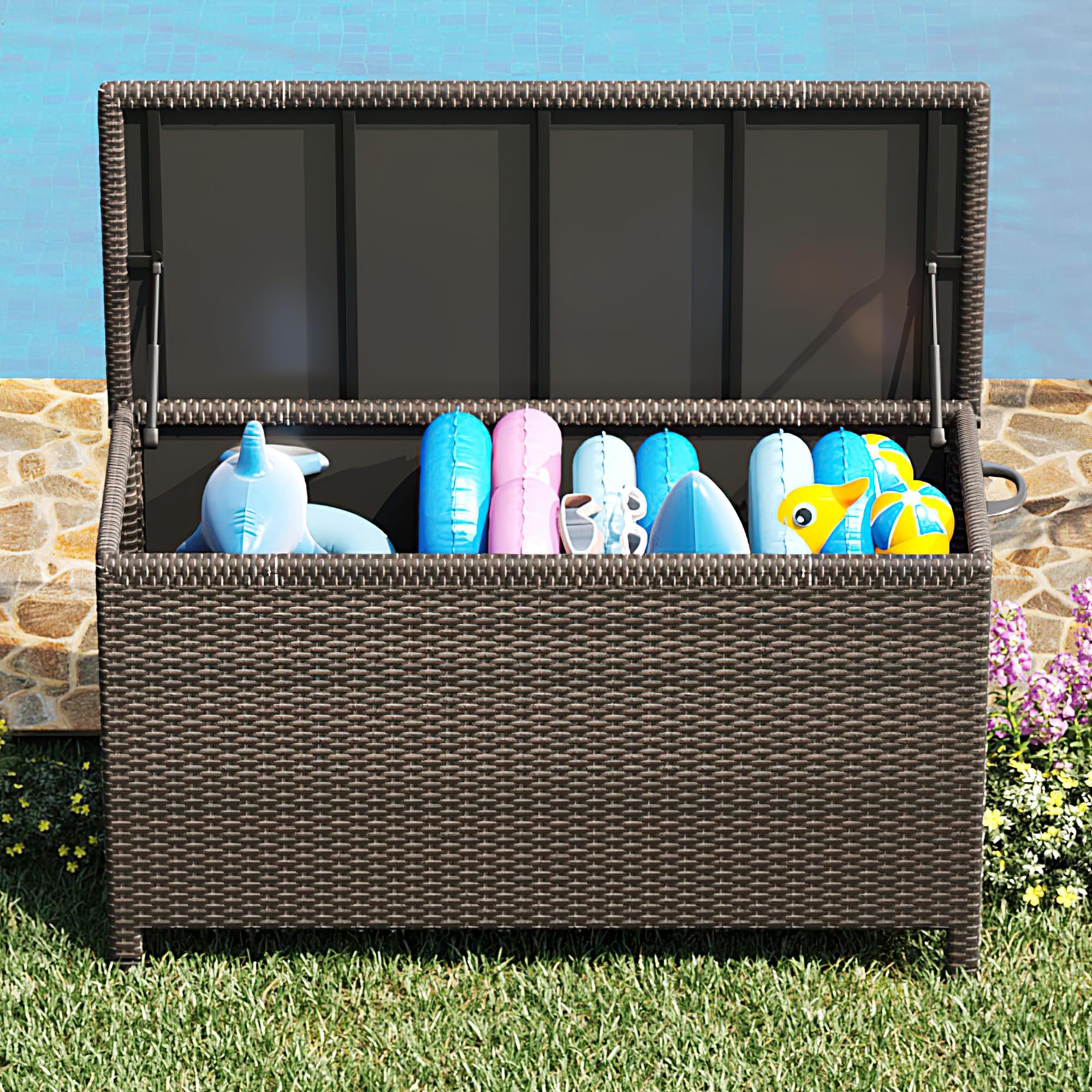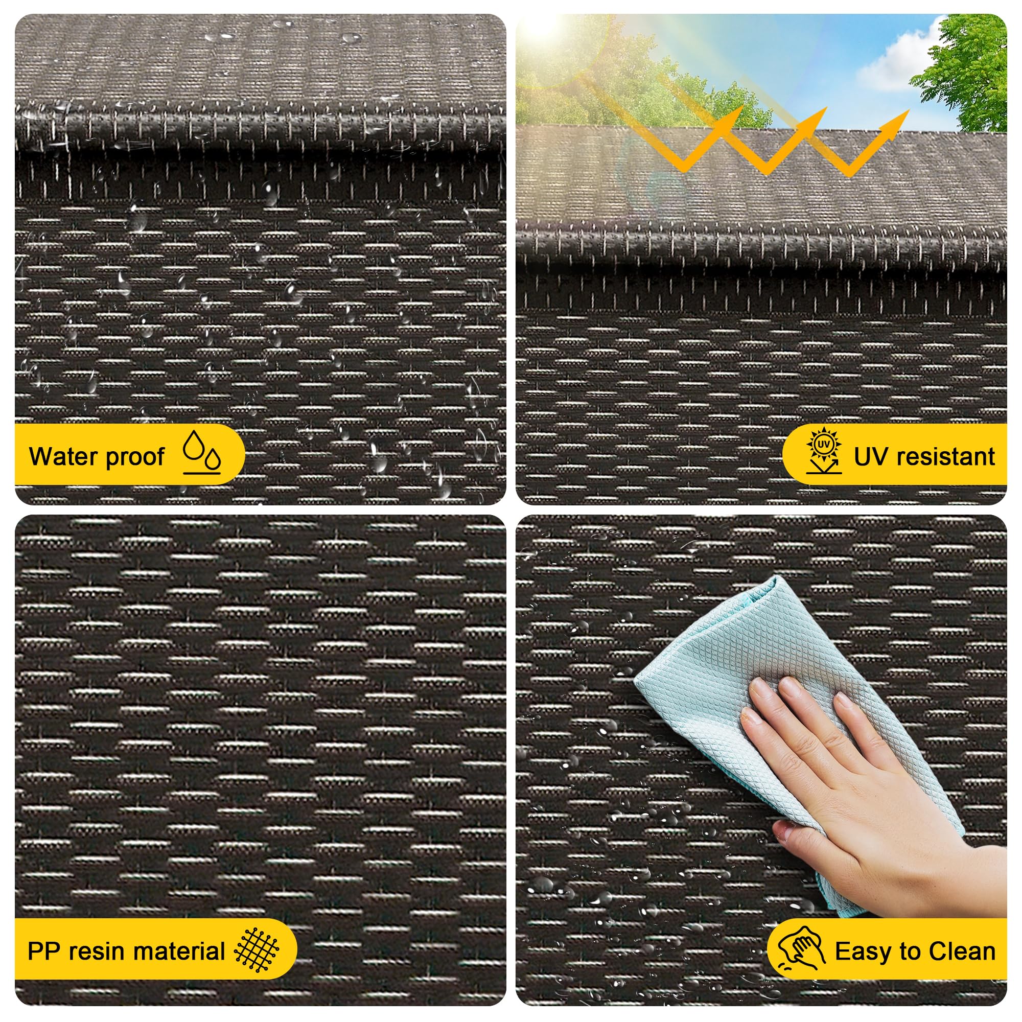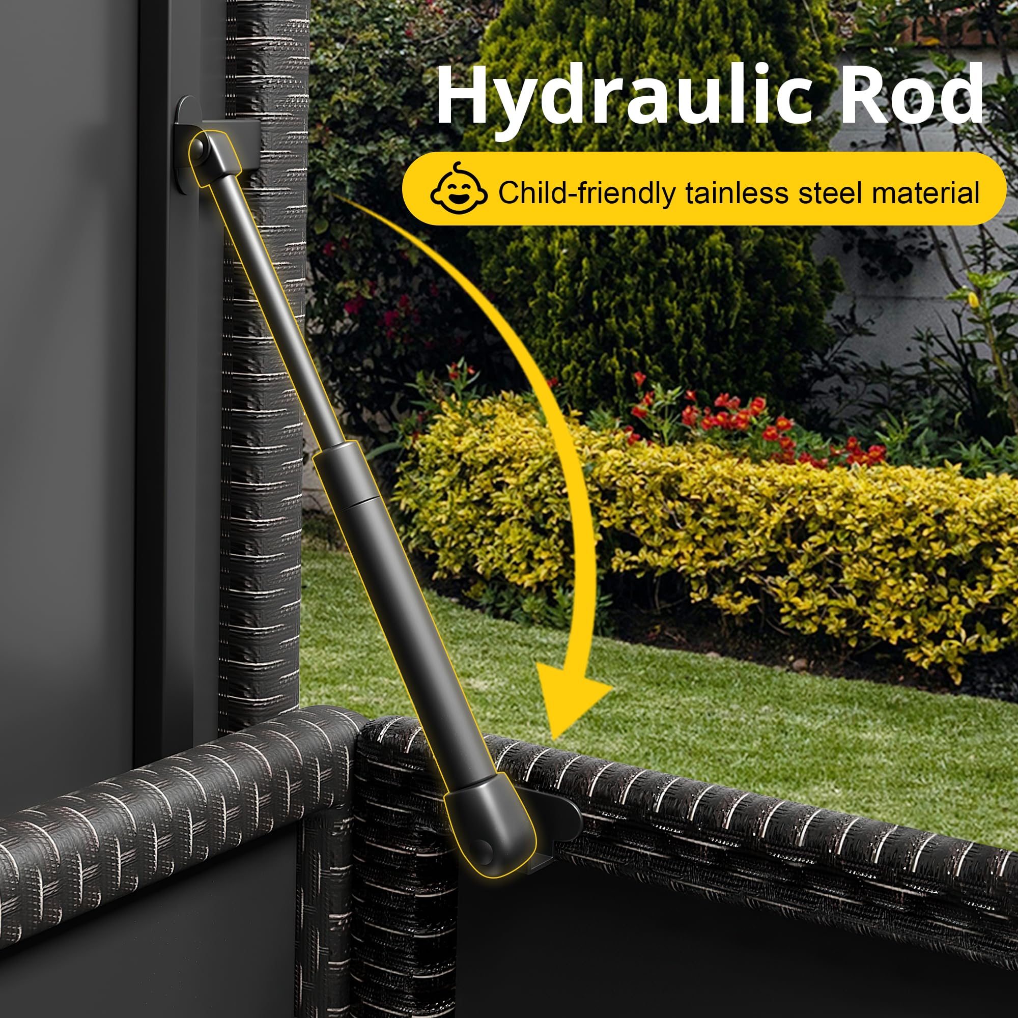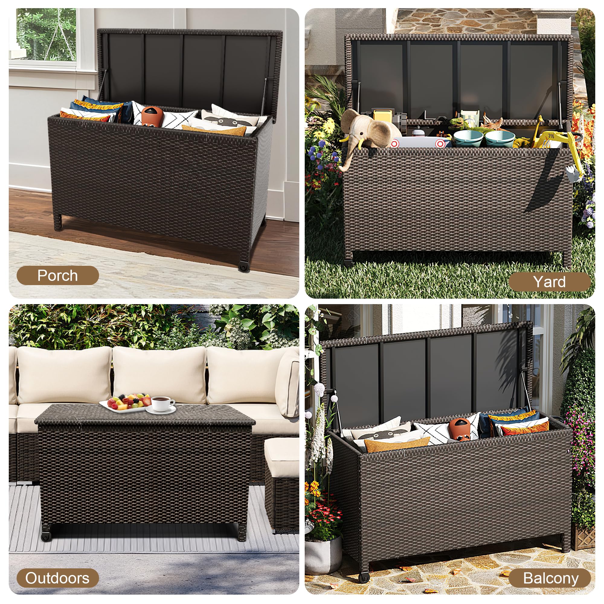 [ Upgraded Waterproof Liner] : Our Rattan Outdoor Storage Box features an upgraded 100% waterproof liner to keep the contents of the storage chest dry and tidy at all times. The top is constructed with a powder-coated galvanized frame and PC panel lid, ensuring exceptional weather resistance. This deck box is not only waterproof but also rust-proof and UV-resistant, capable of withstanding various harsh weather conditions.