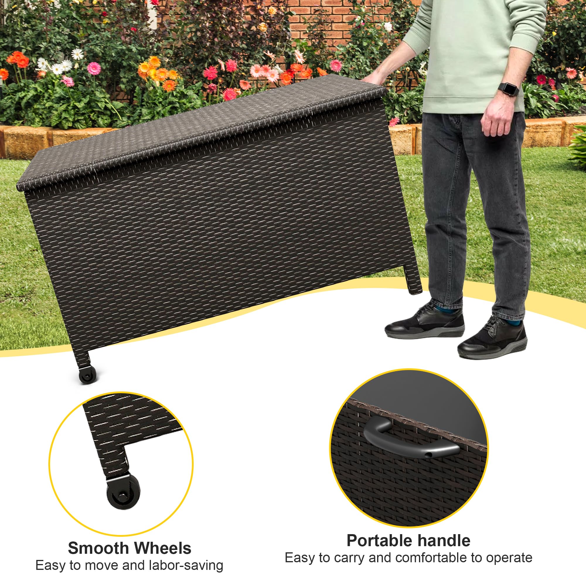 [Handcrafted Weaving Technique]: The frame of this large storage bin with lid is made from high-quality galvanized materials and enveloped in tightly woven PE rattan through exquisite handcrafting. This ensures that the large deck box is resistant to rust, fading, and cracking. The classic rattan style enhances the aesthetic appeal of your outdoor area while guaranteeing durability.