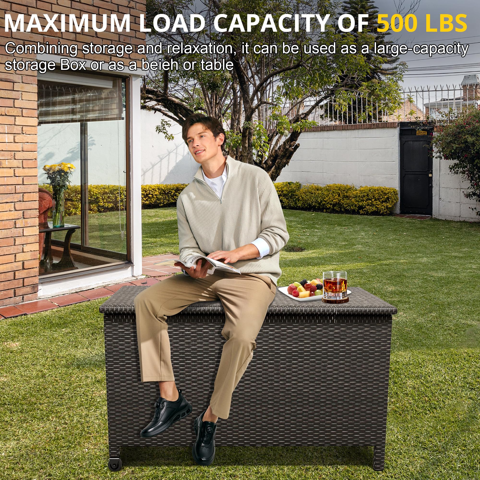 [Versatile Design]: The top of this outdoor storage bin supports up to 500 lbs, offering multiple functionalities as a patio seat, side table, storage bench, or footstool. Its versatile design makes it a perfect addition to any outdoor space.
