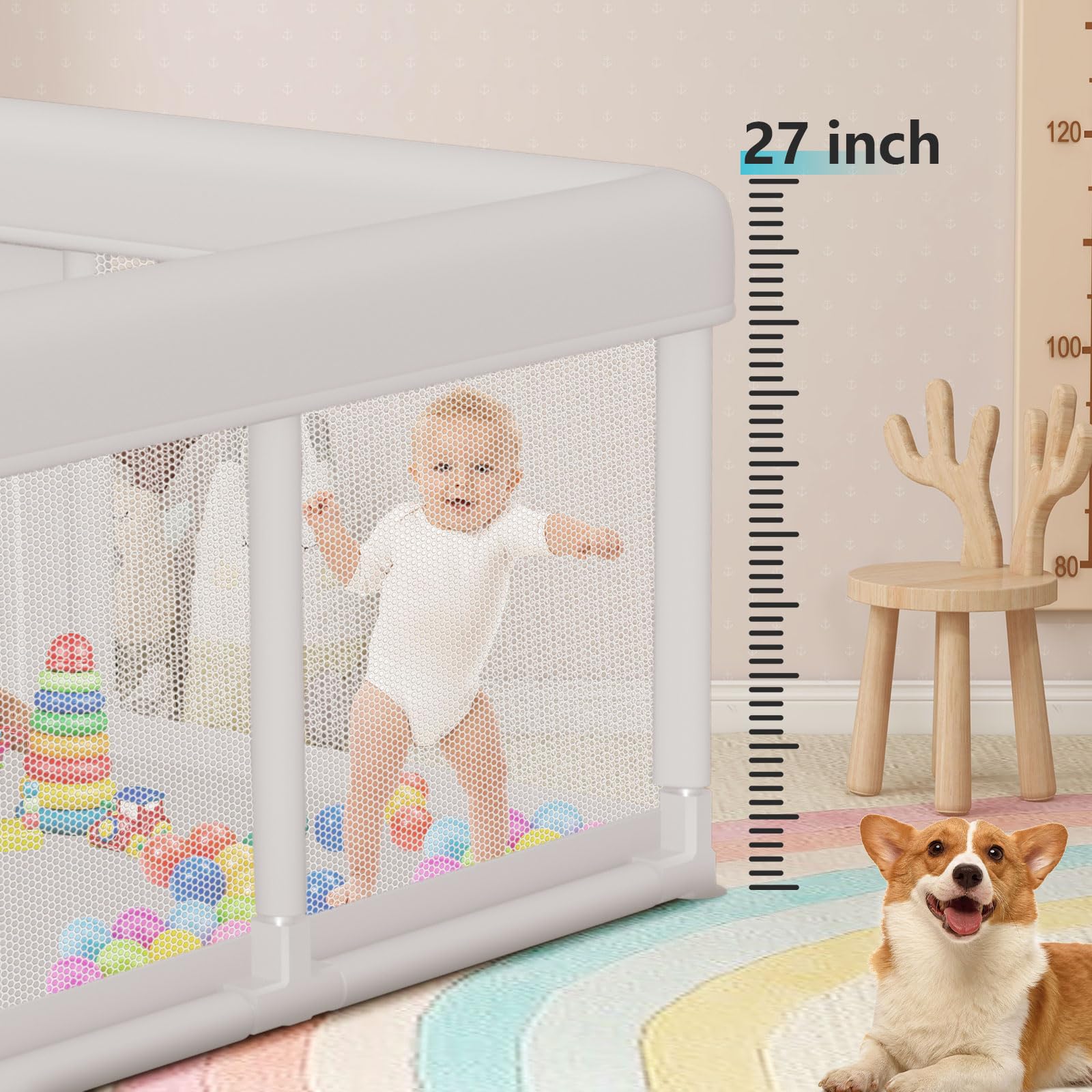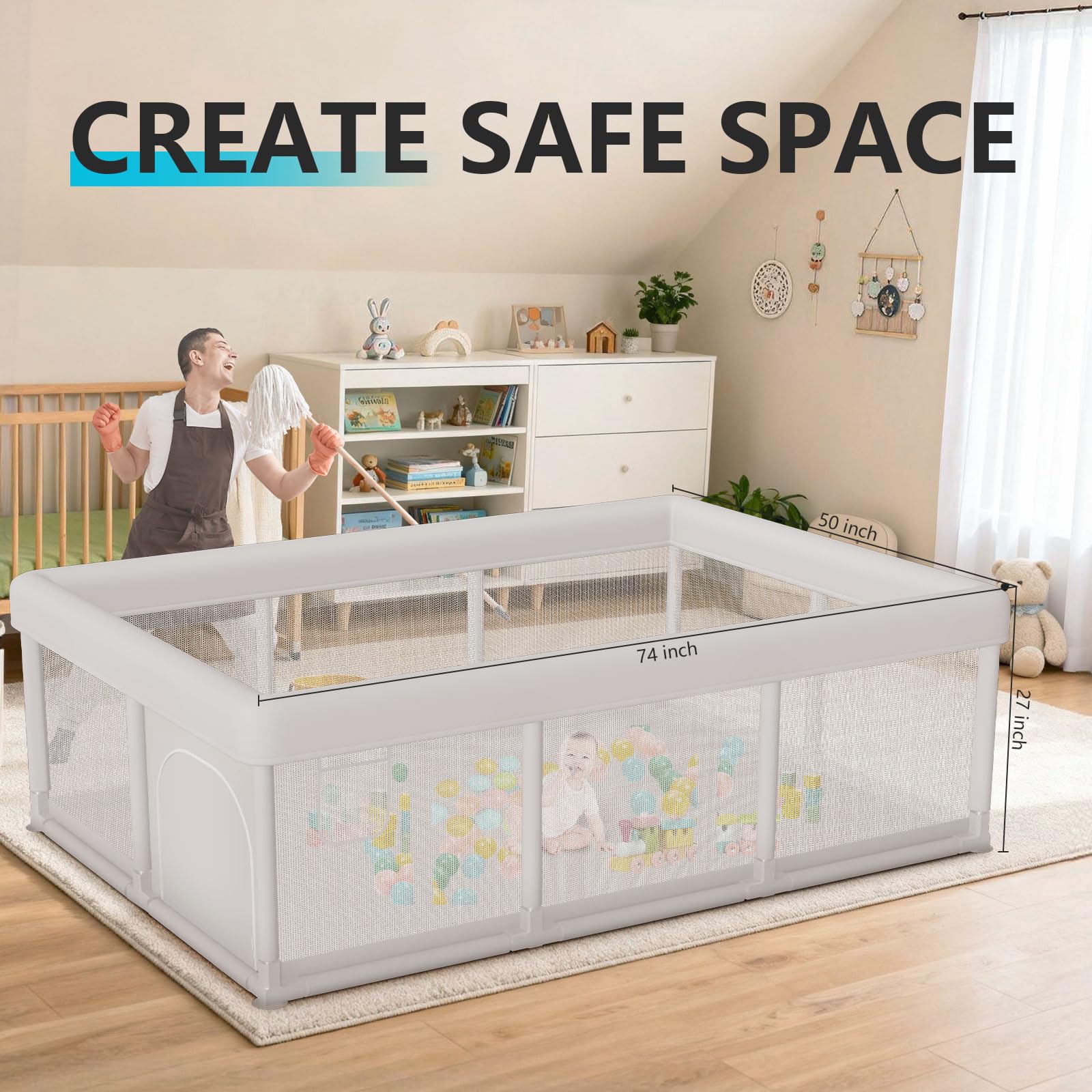 【ENOUGH SPACE PLAY AREA】:Our 74x50x27 inch play pen can accommodate 4 babies and an adult to play at the same time, the small play yard is easy to move and can be placed anywhere. Scientific height, Scientifically tall enough for toddlers 6 months to 6 years to help them stand and walk. (Note: Mat not included)
