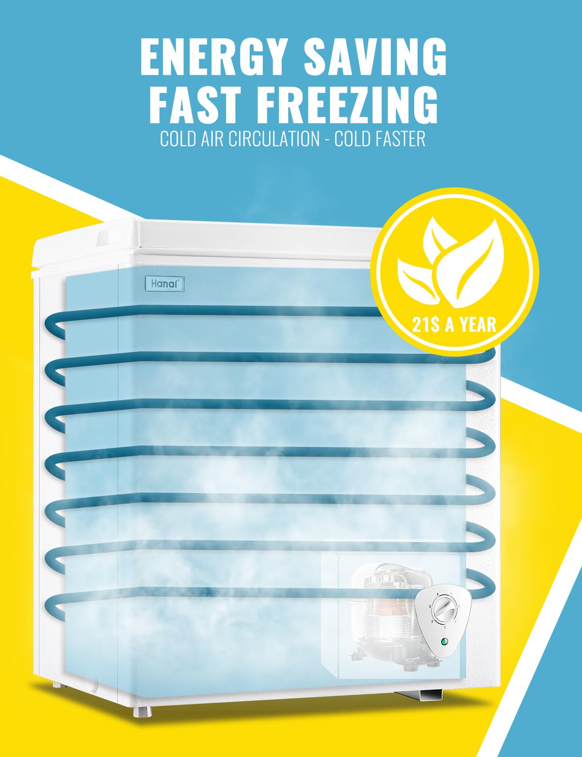 SUPER QUIET: The small chest freezer has efficient refrigeration and excellent heat insulation mean, so its compressor will only work several times a day; And we specially deal with its noise so that the noise will not be louder when it works