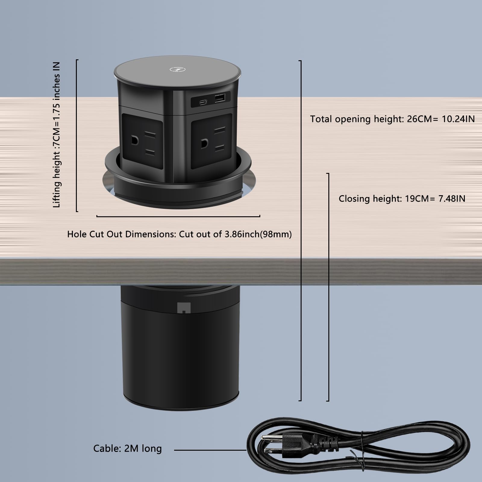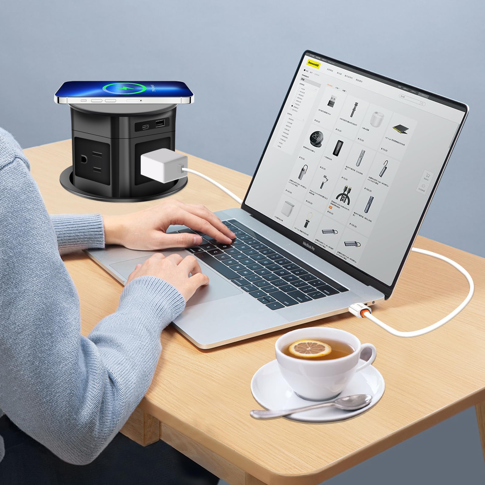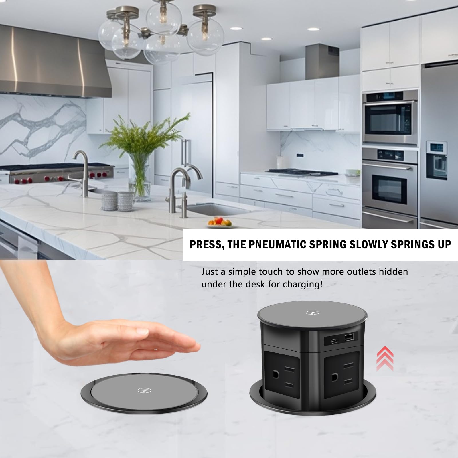 TIANDIGP Pop Up Outlet; 15W Wireless Charger, 4 Outlets 1875W USB C 20W Super Charging 6.5FT 16AWG Cable 3.86 inch Desk Hole Pop Up Power Outlet for Kitchen Countertop,Office Table (Black)