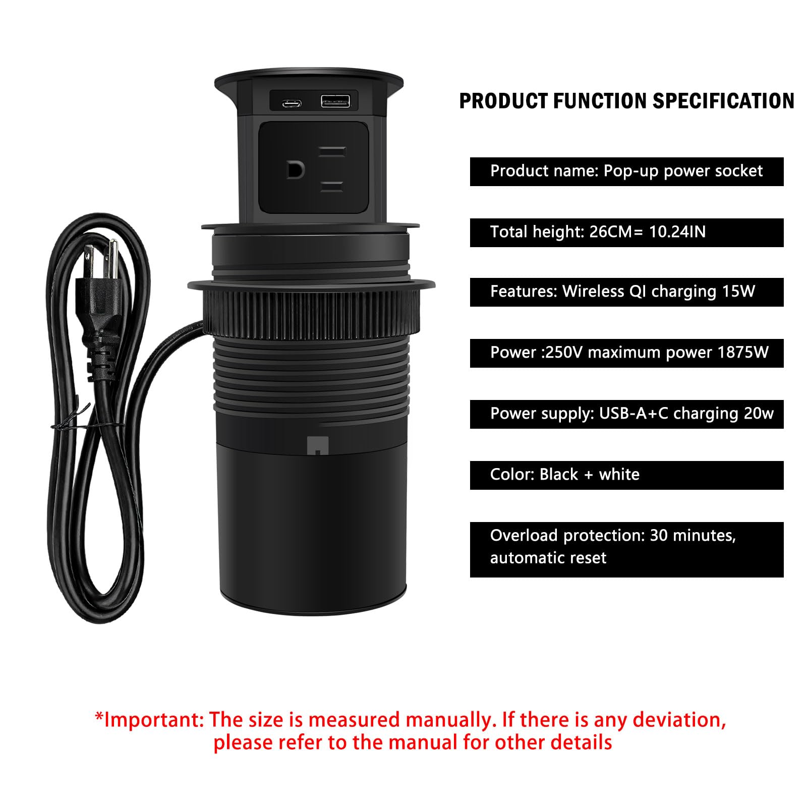 2:Pop Up Power Outlet-Automatic Pop Up Electrical Outlets for Countertops:with wireless charger on the top of the power strip,15W max fast wireless charging pad,compatible with all devices which apply with Qi standard. USB-A/C 20W Super fast charging Pop Up Outlet with USB Ports:1 PD20W USB-C ports PD20W USB-C ports(5V/3A 9V/2.22A 12V/1.67A) and 1 USB-A port(5V/3A 9V/2A 12V/1.5A Max 20W). AC outlet: 125V/15A/1875W.6.5FT 16AWG extension cord.