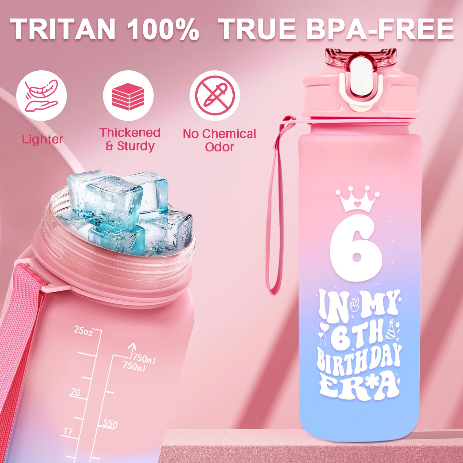 【"IN MY 6TH BIRTHDAY EAR" 25oz Sports Water Bottle】Durable & BPA-free, non-toxic plastic, it is a safe choice for both children and adults alike. Open with one hand by clicking the button to access water. Featuring the words "IN MY 6TH BIRTHDAY EAR" and scale mark, motivational and beautiful. This bottle is lightweight. Easy to carry to your camping, gym, school, or anywhere. Cleaning is also a breeze