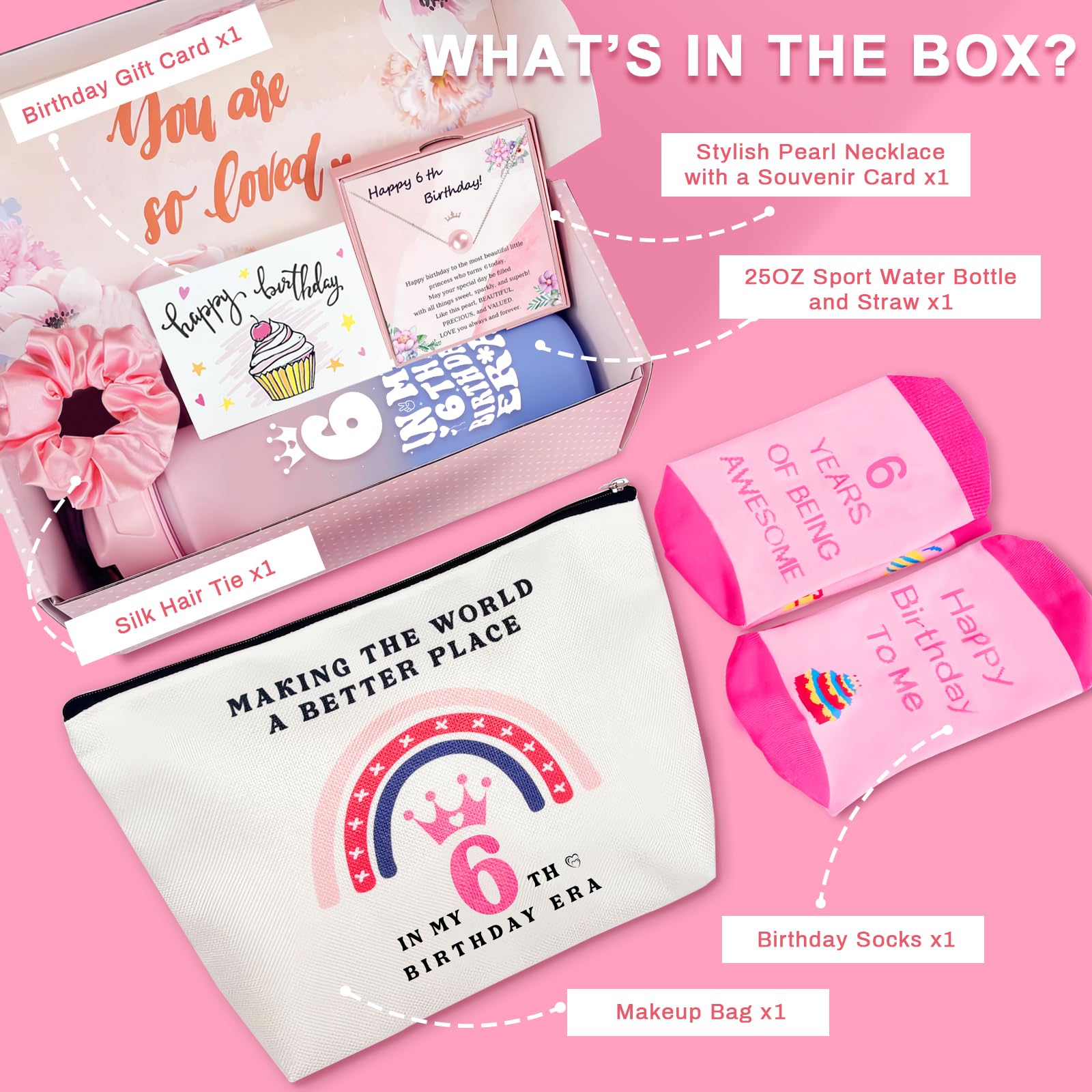 【7 Pieces Unique 6th Birthday Wishlist Gifts 】7 Beautifully packaged gifts 1 x 25 oz tumbler, 1 x stylish pearl necklace with a souvenir card, 1 x double-sided printed cosmetic bag, 1 x fancy birthday socks, 1 x hair tie, 1 x birthday card(Write your blessings), 1 x gift box. Receiving this gift box set, she will feel extremely happy and cherished, as if she has an exclusive luck and blessing