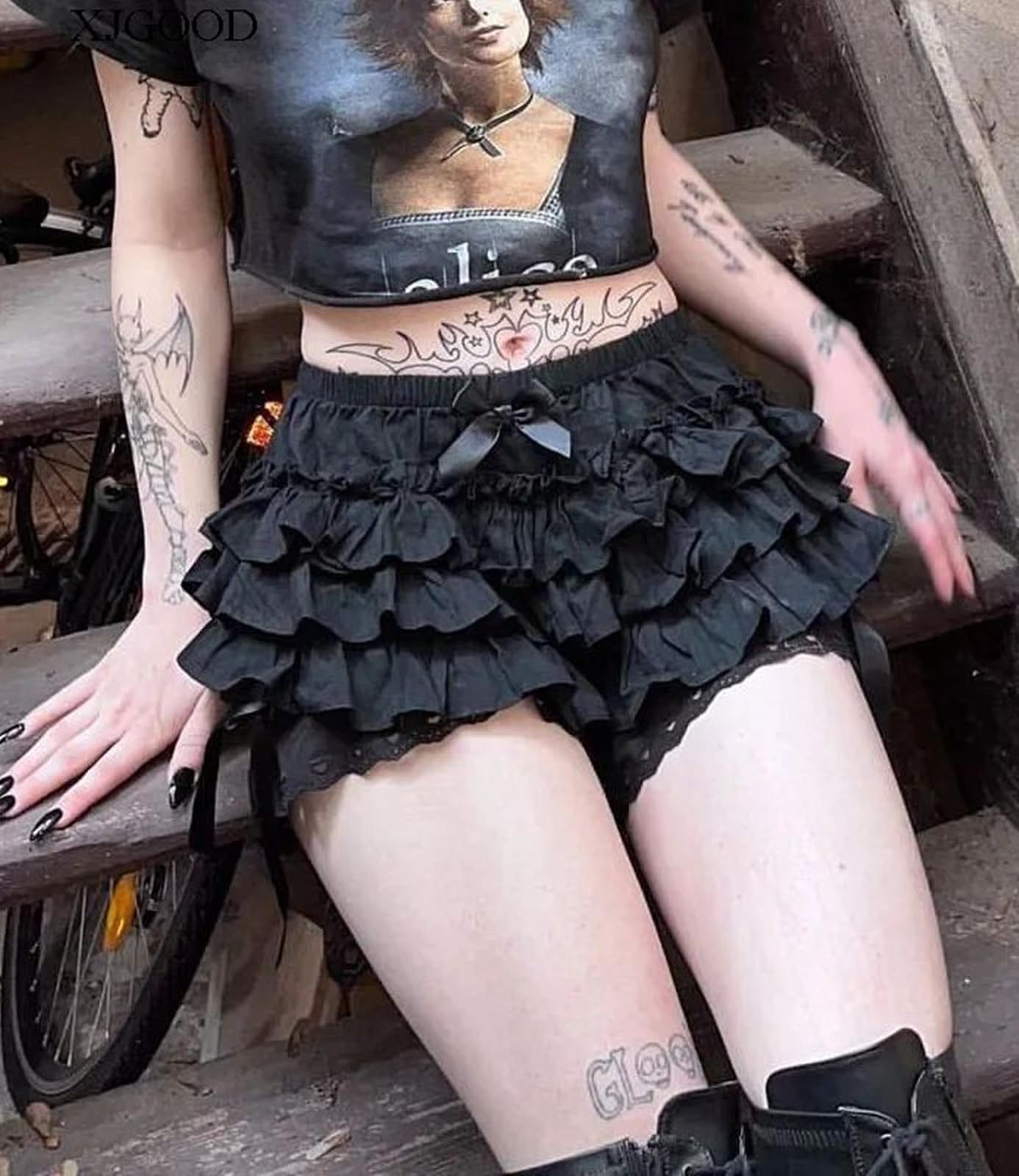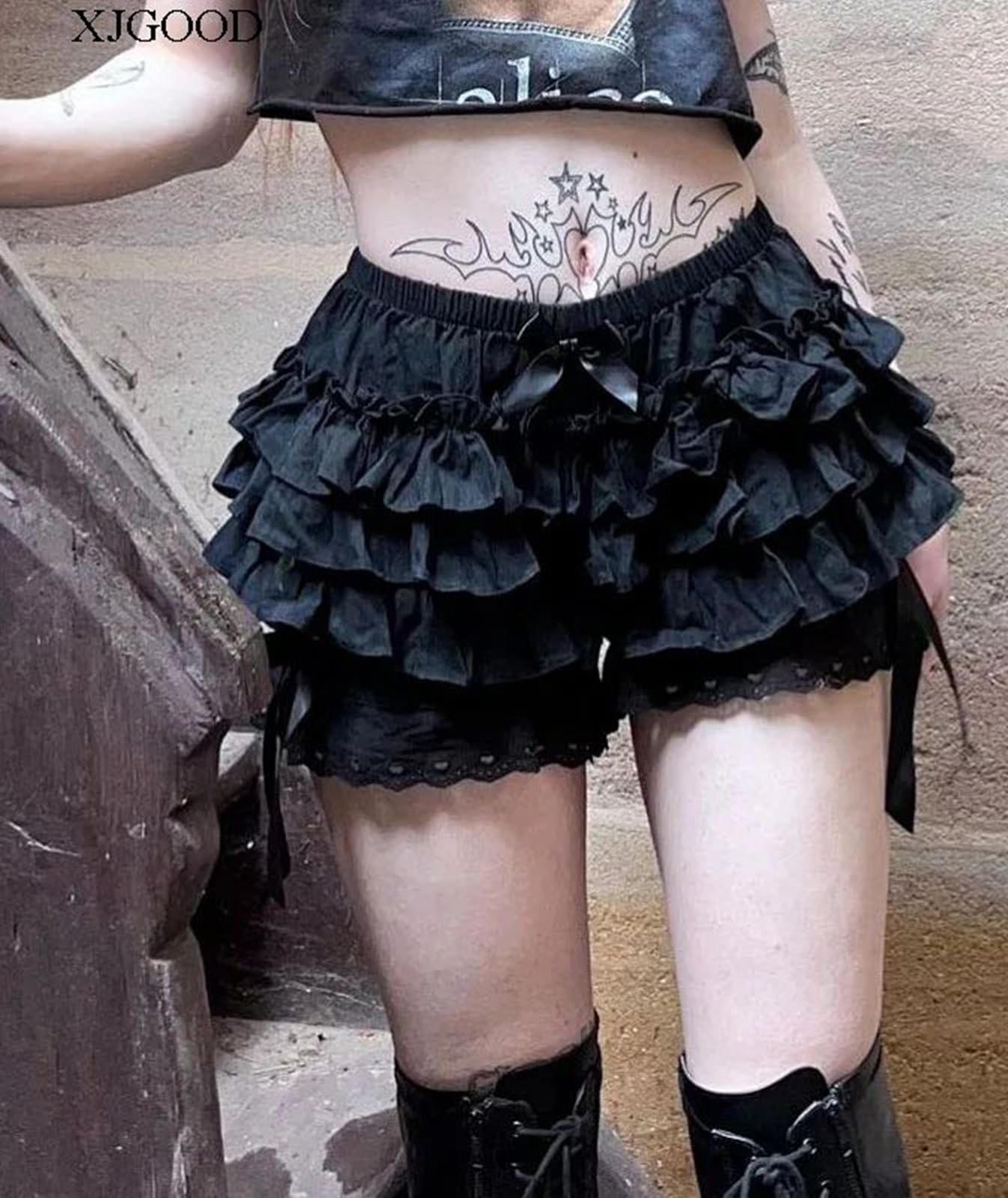 Y2k look: Elastic Waist. Stretchable. One size fits US0-US14 size, fit most body types and ages.Women's victorian gothic lolita ruffle pumpkin shorts, girls kawaii layers ruffle bloomers under shorts.