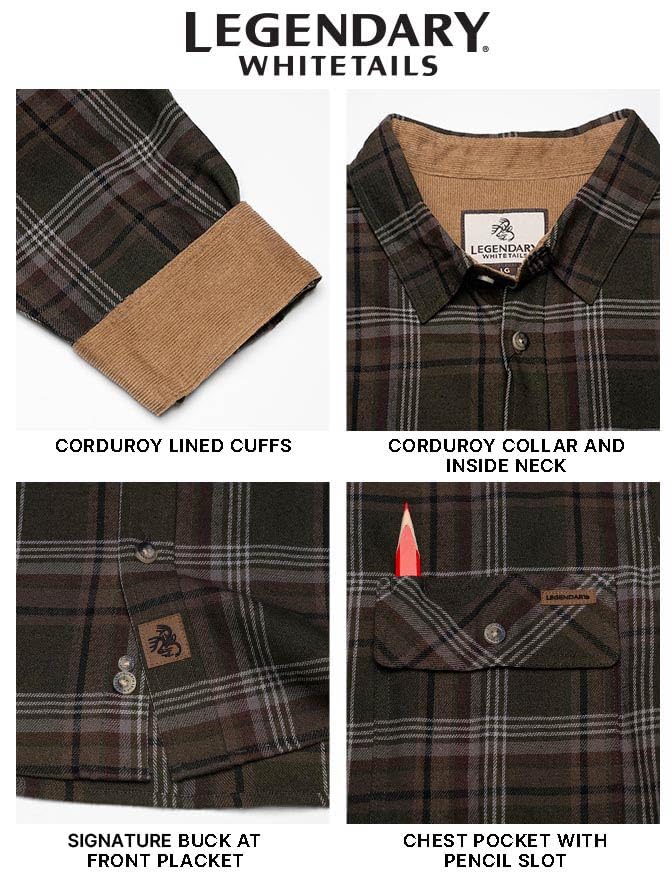 Description Our original single pocket flannel - The Buck Camp Flannel Shirt is the perfect weight to wear alone or layered over a t-shirt or under a shirt jacket. The traditional style and signature corduroy details offer unmatched durability, while the relaxed fit and brushed cotton flannel provide ultimate comfort. With multiple exclusive plaids and solids, they're suitable for any occasion from the woods to the office. The Buck Camp Flannel Shirt gives you an incredible "bang for your buck"! Big & Tall sizes are designed for men over 6'2" and add 2" in body length and 1-1⁄2" in sleeve length.