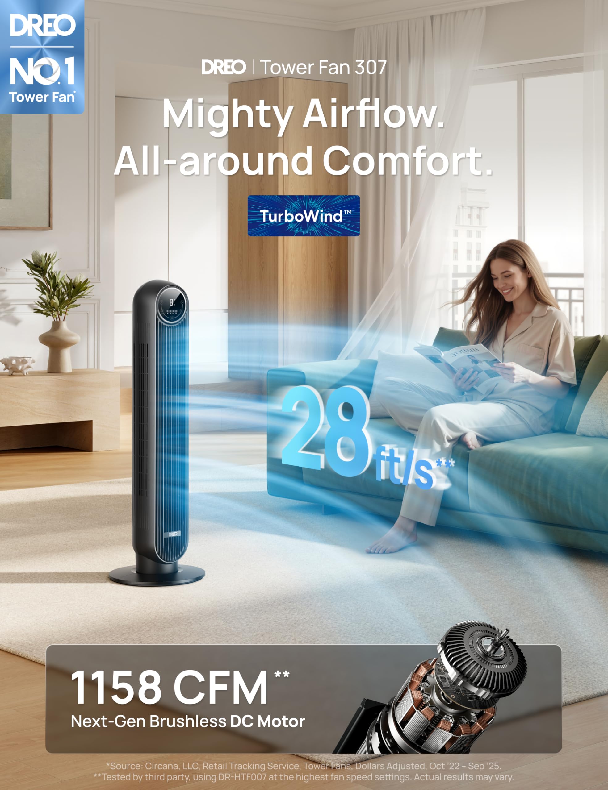 ๐๐จ๐ซ๐ ๐๐จ๐ฐ๐๐ซ๐๐ฎ๐ฅ ๐ฐ๐ข๐ญ๐ก ๐ฎ๐ฉ๐ ๐ซ๐๐๐๐ ๐๐ ๐ฆ๐จ๐ญ๐จ๐ซ: Thanks to DREO's upgraded brushless DC motor combined with TurboWind technology, the tower fan achieves faster spin to deliver stronger airflow, with wind speeds reaching up to 28ft/s and projecting up to 34ft.