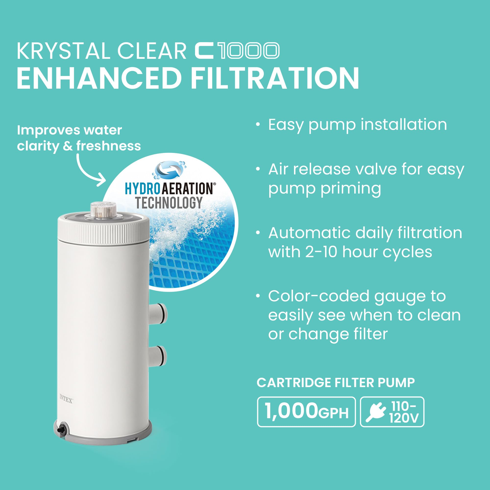 ✔ ADVANCED FILTRATION – The included 1,000 GPH pool filter pump features dual-suction fittings and HydroAeration Technology, providing improved circulation and filtration, improved water clarity, and increased negative ions.
