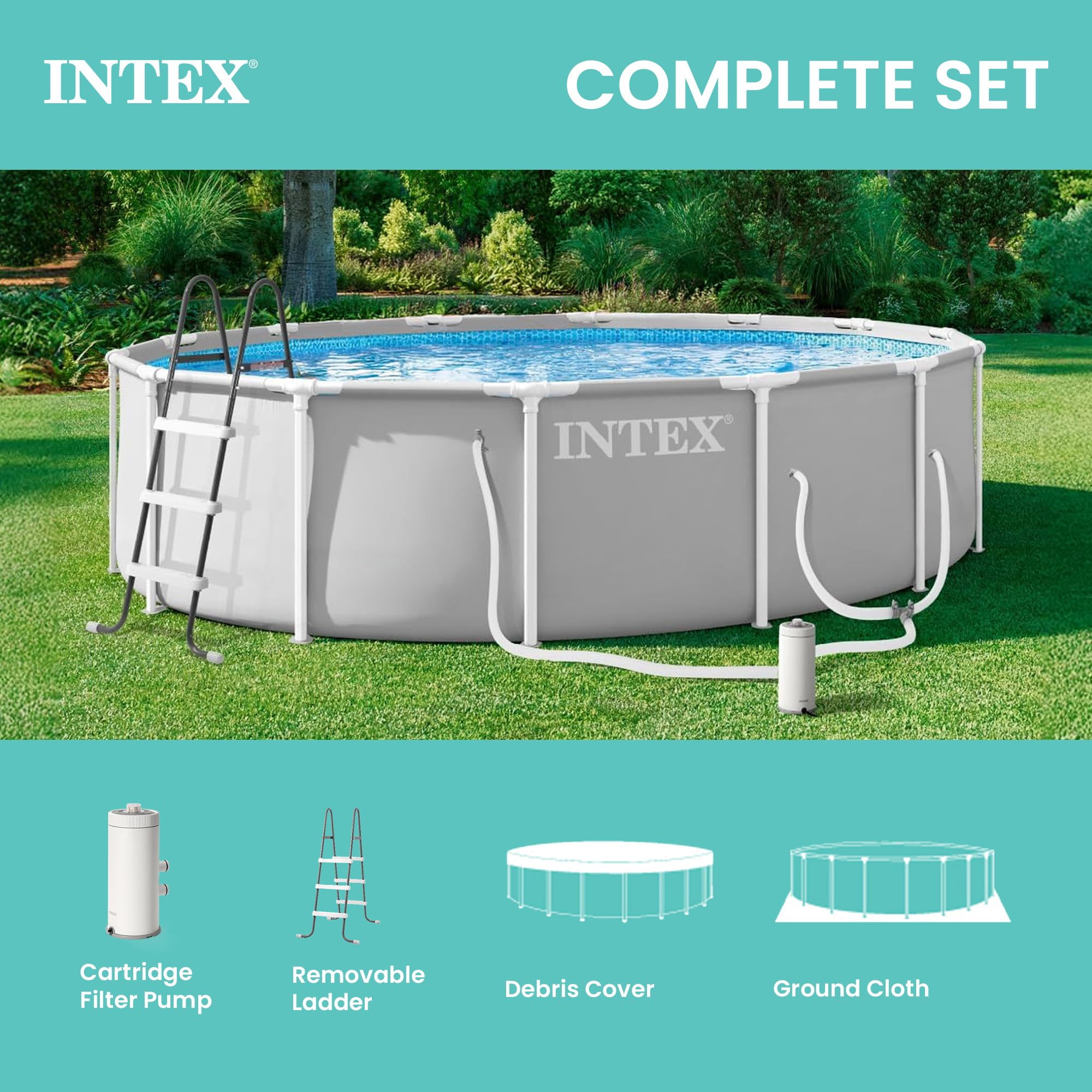 ✔ EASY TO ASSEMBLE – Ready for water in just 45 minutes; spread out on level ground preferably on top of the ground cloth, and set the metal frame. The outdoor set includes a pool, 1,000 GPH cartridge filter pump, (1) filter cartridge, ladder, pool cover, and ground cloth.