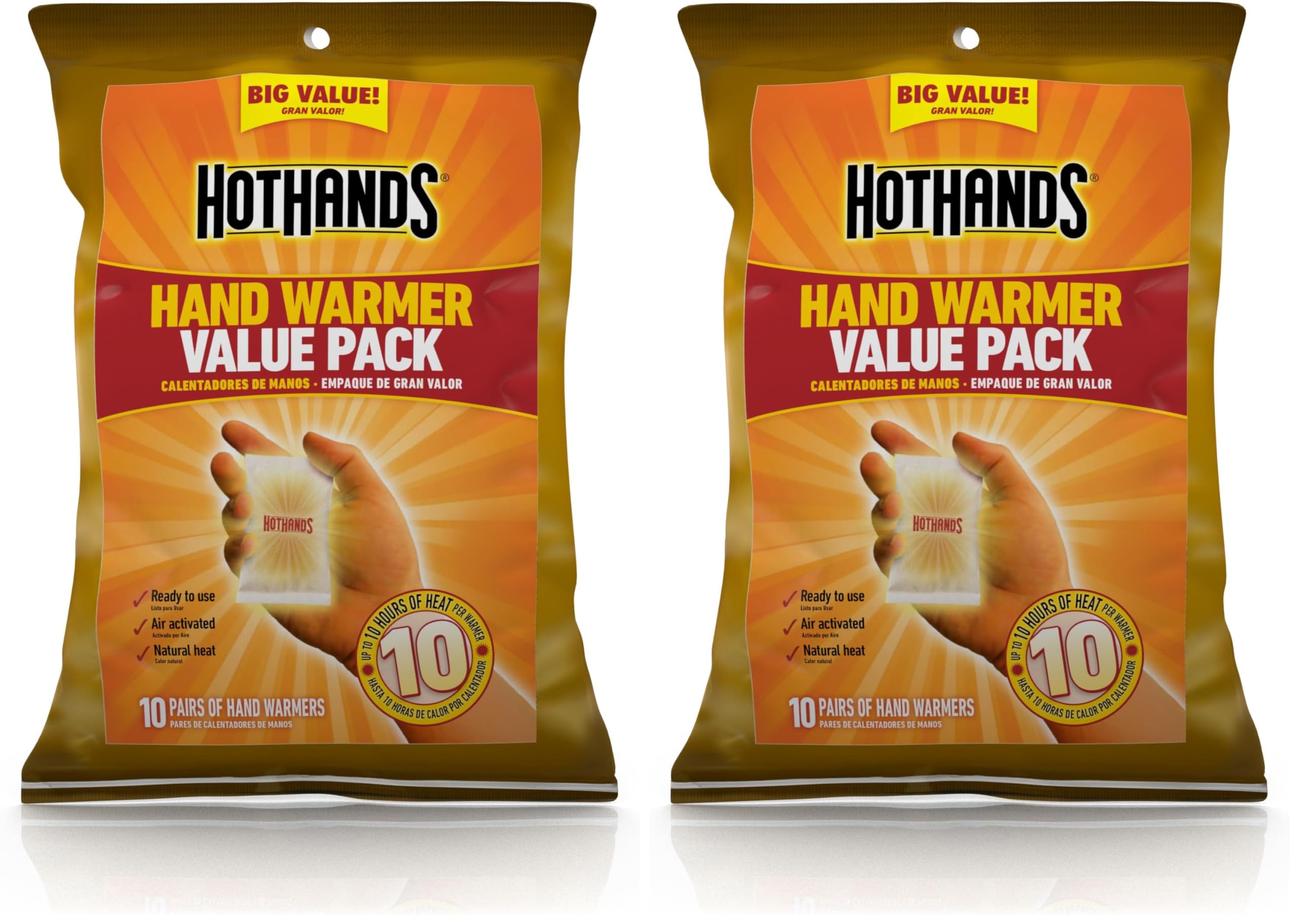 Bring the Heat! HotHands warmers are single use air-activated heat packs that provide everyday warmth and are ideal for keeping your hands warm when the temperature gets cold. They provide safe, natural heat, so you can enjoy the great outdoors during those harsh winter months. Our hand warmers are designed to fit in your pockets or the palm of your hand. Convenient, Compact, Portable. Thoughtfully designed so you can enjoy HotHands anytime, anywhere. Specs & Details: • Quantity: 20 Individual Hand Warmers (10 pairs). • Duration OF Heat: Up to 10 hours of heat. • Activation Time: 15-30 minutes. • Average Temperature: 135 degrees Fahrenheit (57 degrees Celsius). • Max Temperature: 158 degrees Fahrenheit (70 degrees Celsius). • Ingredients: Iron Powder, Water, Salt, Activated Charcoal, and Wood Fiber. • Country of Origin: Made in the USA using domestic and imported materials. • Storage: Keep in a cool place out of direct sunlight. Trusted - HotHands, the leader in air-activated warmers, has been warming hands, feet, and bodies for over 20 years. It’s a brand trusted all over the world by professional athletes, outdoor sporting enthusiasts, spectators, skiers, outdoor worker and by anyone wanting safe, convenient, concentrated warmth in cold weather conditions. Directions - Do not open the outer package until ready to use. Remove warmer from the outer package: shake to activate. Do not open, puncture, or tear warmer. Warmer heats up in 15-30 minutes. If heat decreases, expose warmer to air and shake. After use, dispose with regular garbage. Ingredients will not harm the environment. Buy with Confidence - To ensure you receive genuine HotHands products when shopping online, please only purchase from authorized distributors or retailers or an Amazon listing that clearly states the product is sold and shipped directly by Amazon. com. Unauthorized sellers, such as private sellers (not commercial sellers) may offer outdated products or imitations not meeting HotHands quality standards. We want our customers to purchase our products with the confidence that they are getting genuine, quality HotHands products.
