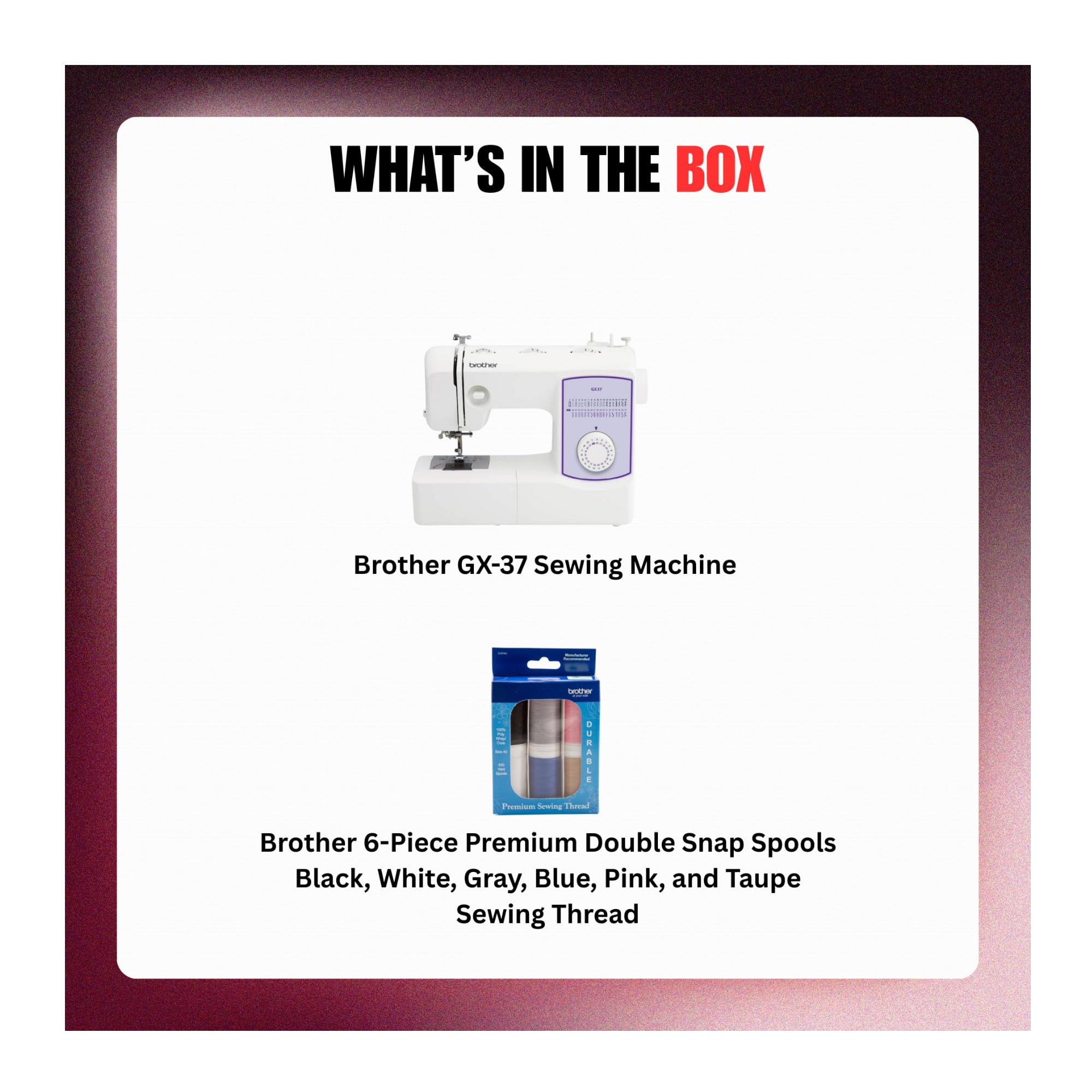 Included accessories: The GX37 includes 6 sewing feet, needle set, bobbins, instructional DVD, manual and more