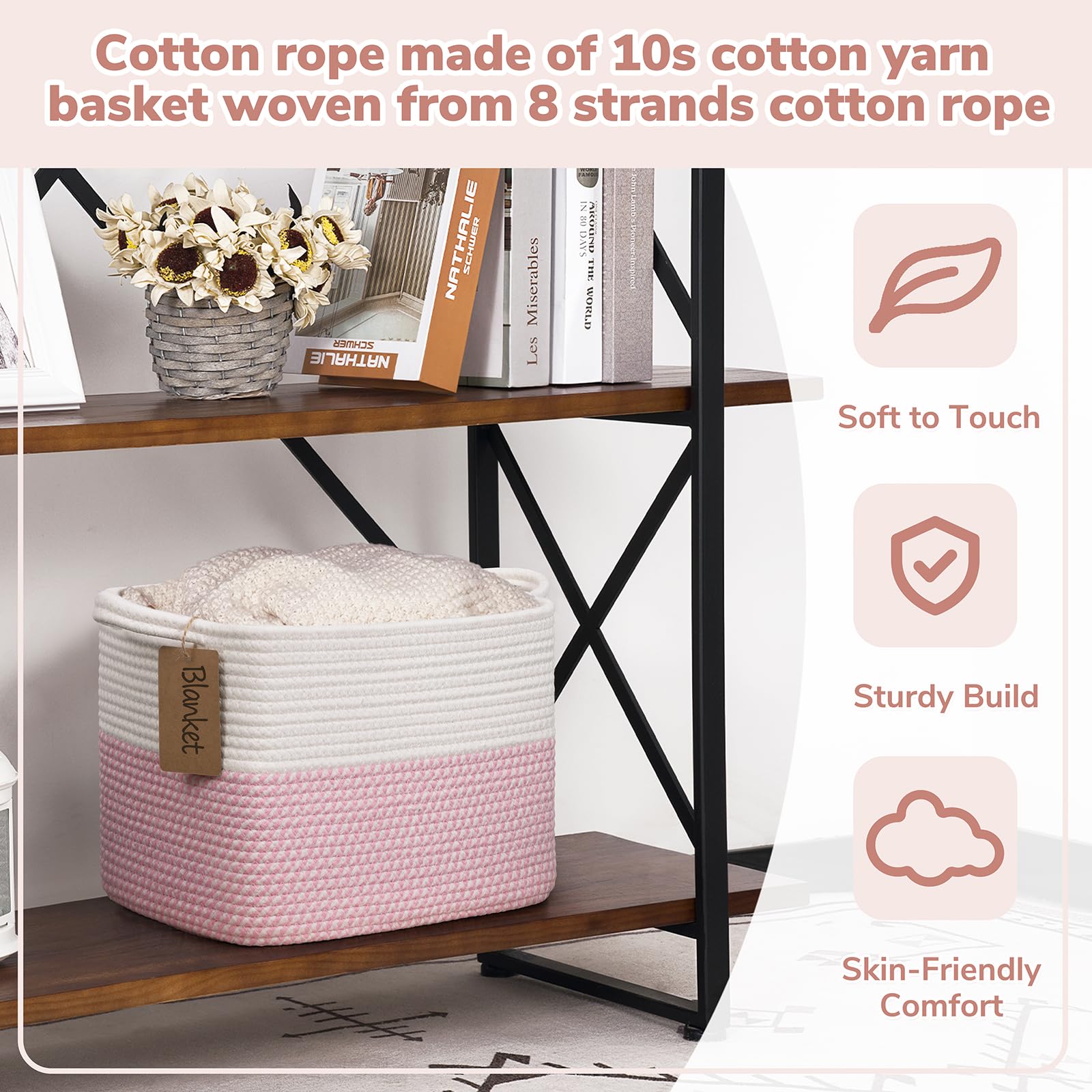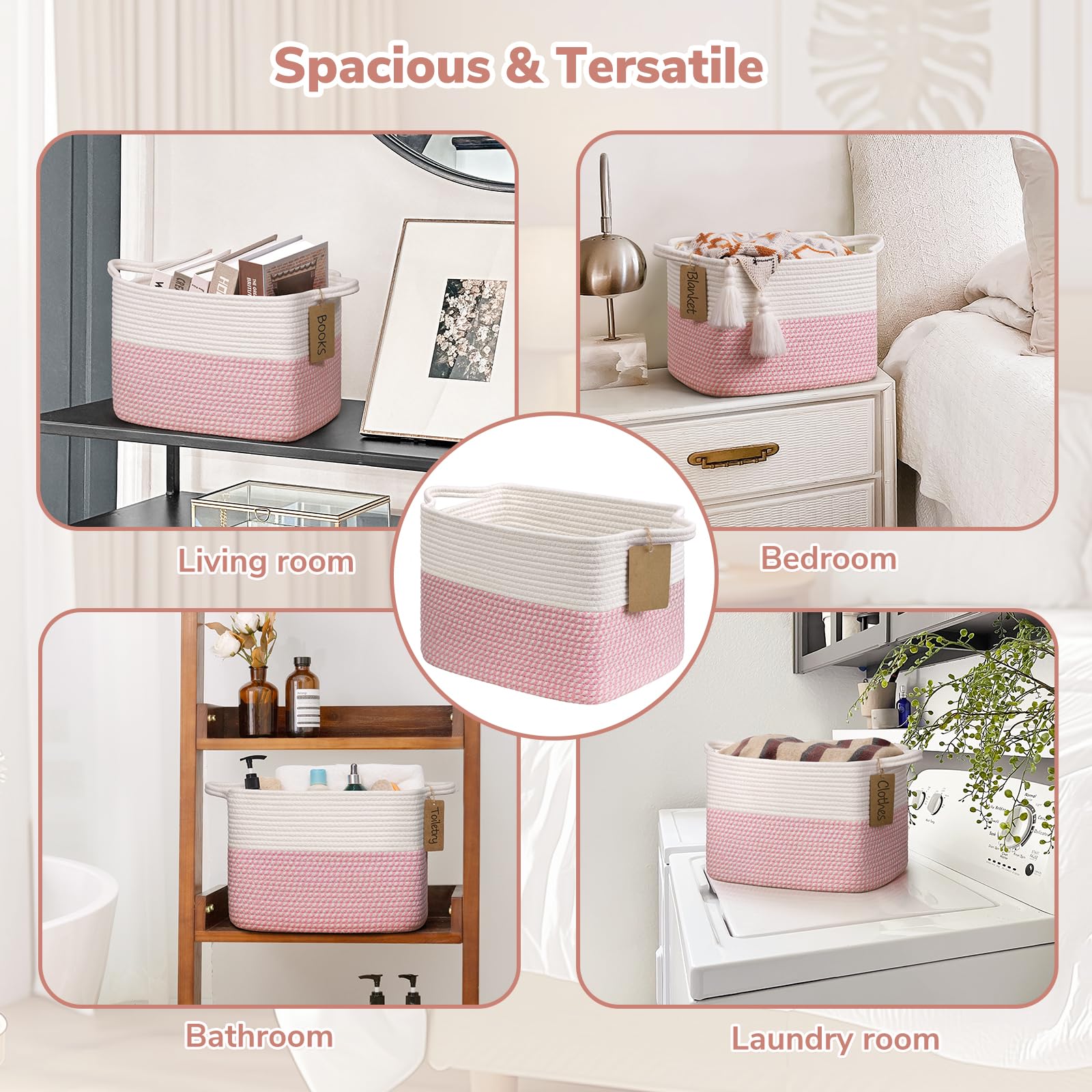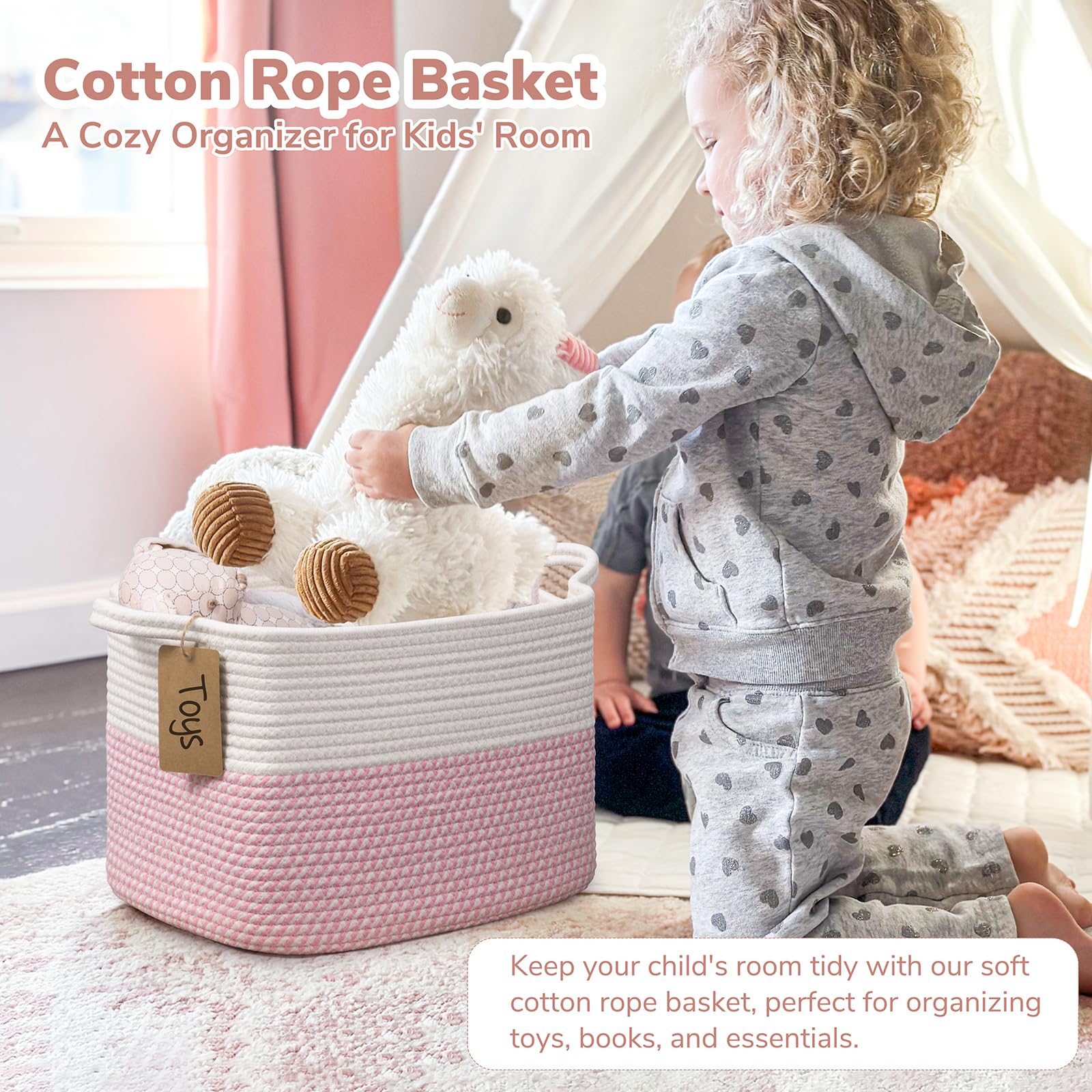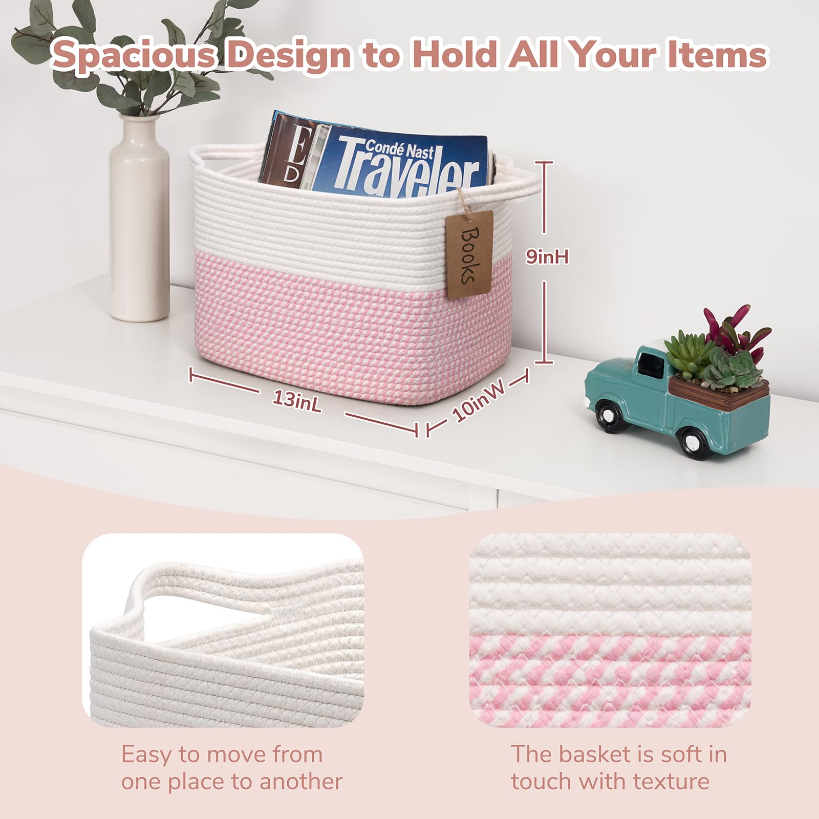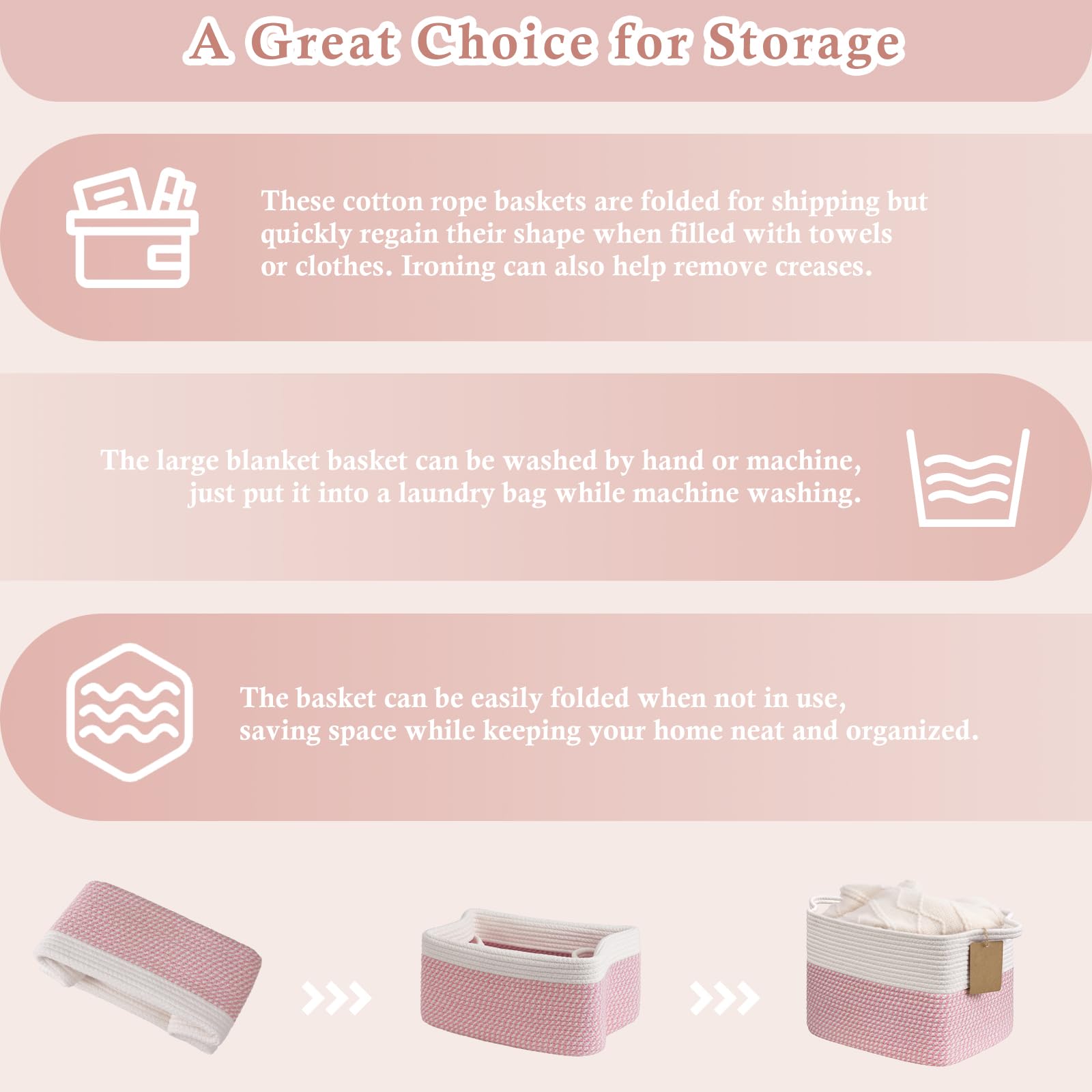 Pink Rope Storage Baskets for Organizing - Material: Cotton - Size: 13 x 10 x 9 inches - Multiple Use: You can have the storage basket in nursery, living room, bedroom, bathroom or laundry room to hold your clothes, blankets, toys storage etc. - Machine Wash: You can put the basket in a laundry bag to wash it by machine or hand wash.