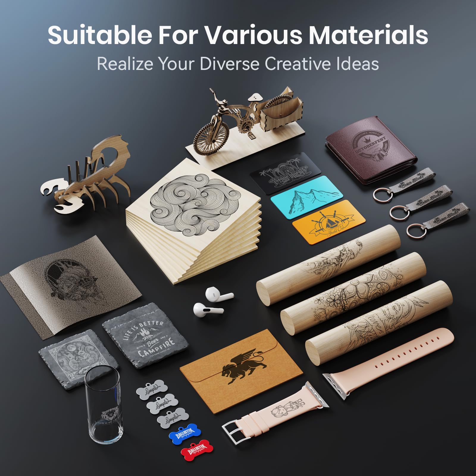 【Multi-Surface Engraving】 The K10 5W engraves non-transparent materials like coated metals,cork,plastics,leather,fabric,and cardboard. For transparent surfaces (glass/ceramic/stainless steel), use colored paper (not included) or darken with a marker. Add a rotary (sold separately) to engrave round/large items like wine glasses or baseballs. Ideal for DIY gifts, pet tags,and educational projects. Note: Avoid engraving metals or reflective surfaces materials, it may damage the laser module.